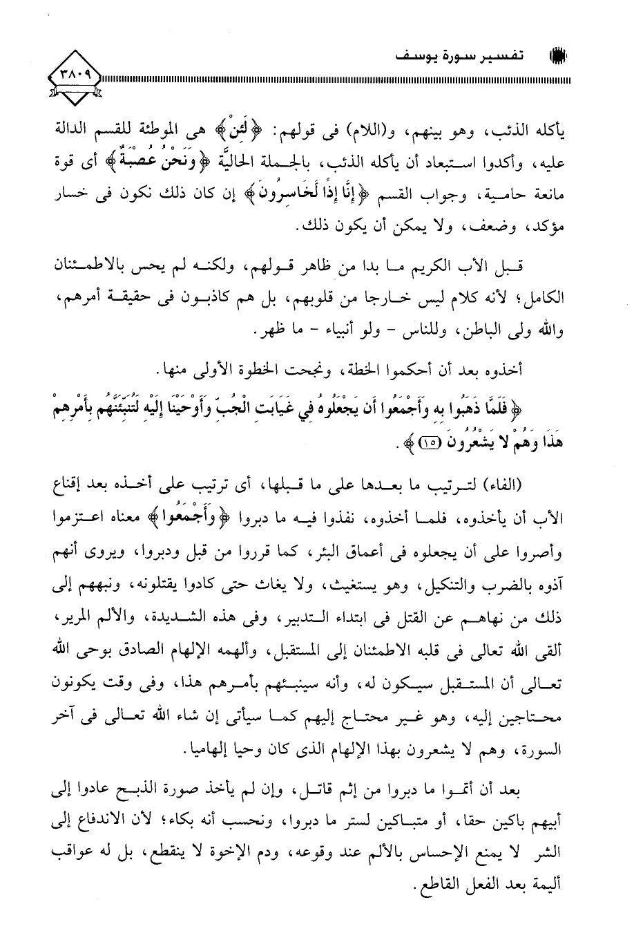 يأكله الذئب، وهو بينهم، و (اللام) في قولهم: (لَئِنْ) هي الموطئة للقسم الدالة عليه، وأكدوا استبعاد أن يأكله الذئب، بالجملة الحالية (وَنَحْنُ عُصْبَةٌ) أي قوة مانعة حامية، وجواب القسم (إِنَّا إِذًا لَّخَاسِرونَ) إن كان ذلك نكون في خسار مؤكد، وضعف، ولا يمكن أن يكون ذلك.