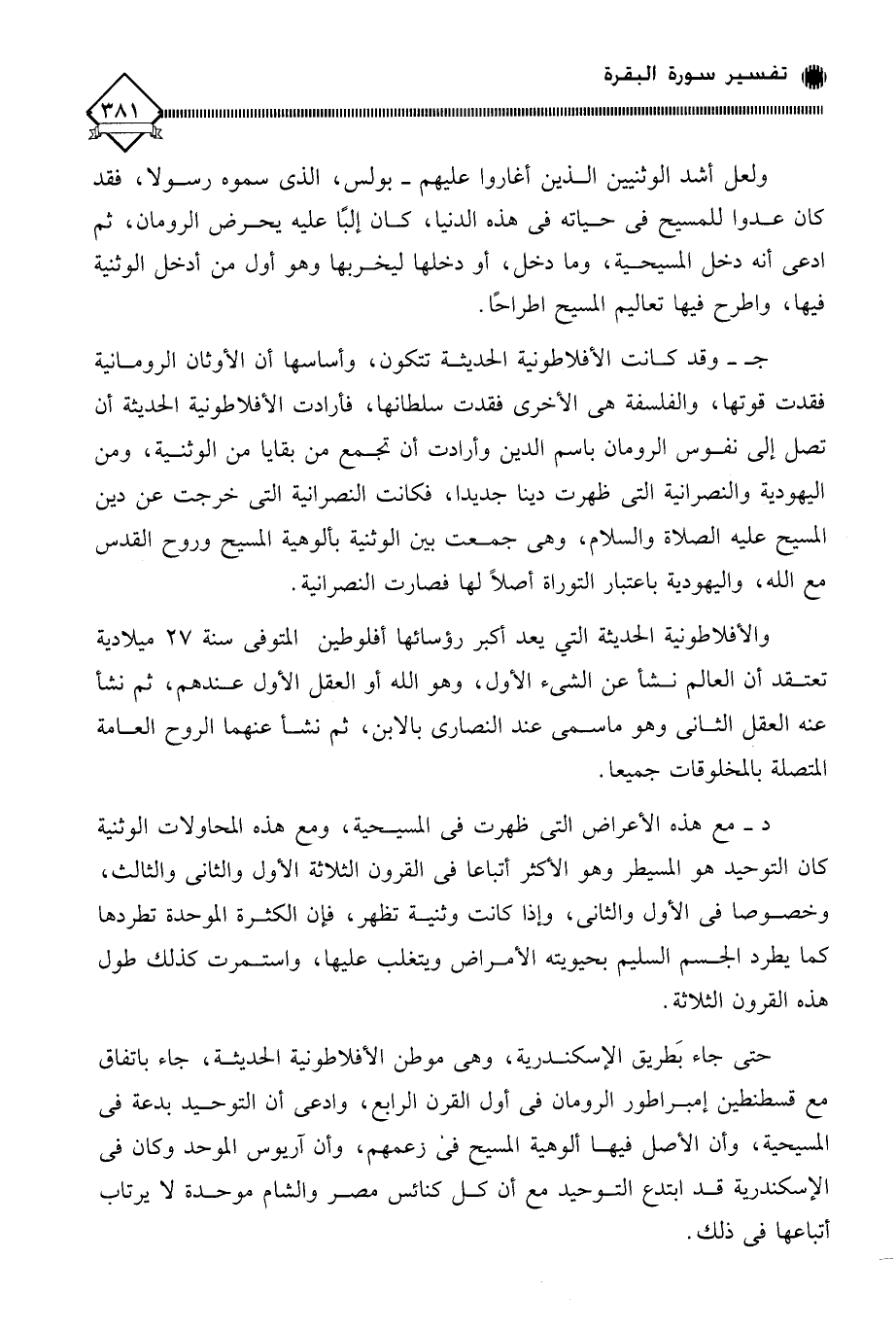 جـ - وقد كانت الأفلاطونية الحديثة تتكون، وأساسها أن الأوثان الرومانية فقدت قوتها، والفلسفة هي الأخرى فقدت سلطانها، فأرادت الأفلاطونية الحديثة أن تصل إلى نفوس الرومان باسم الدين وأرادت أن تجمع من بقايا من الوثنية، ومن اليهودية والنصرانية التي ظهرت دينا جديدا، فكانت النصرانية التي خرجت عن دين المسيح عليه الصلاة والسلام، وهي جمعت بين الوثنية بألوهية المسيح وروح القدس مع الله، واليهودية باعتبار التوراة أصلًا لها فصارت النصرانية.