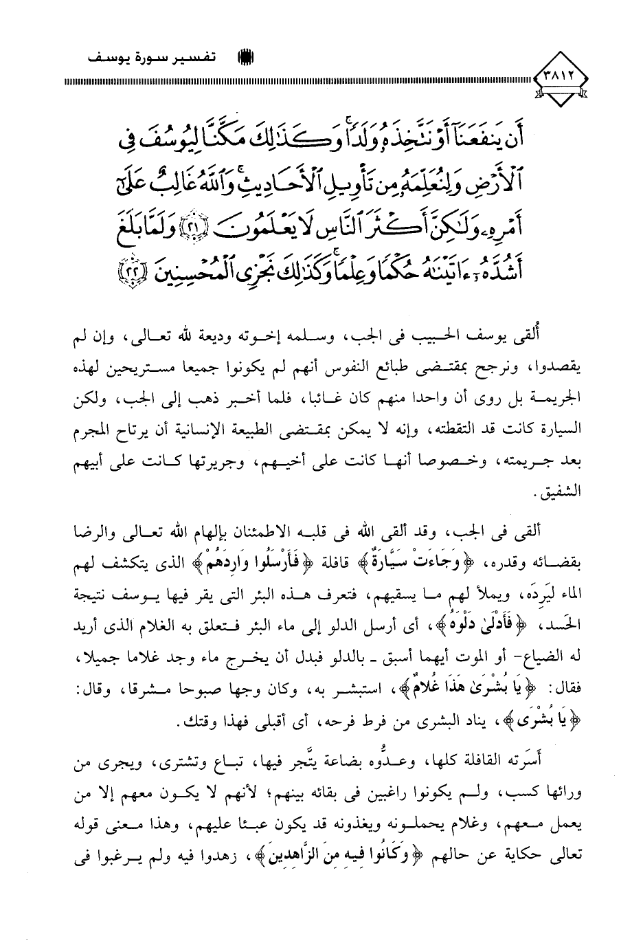 أُلقي يوسف الحبيب في الجب، وسلمه إخوته وديعة للَّه تعالى، وإن لم يقصدوا، ونرجح بمقتضى طبائع النفوس أنهم لم يكونوا جميعا مستريحين لهذه الجريمة بل روي أن واحدا منهم كان غائبا، فلما أخبر ذهب إلى الجب، ولكن السيارة كانت قد التقطته، وإنه لَا يمكن بمقتضى الطبيعة الإنسانية أن يرتاح المجرم بعد جريمته، وخصوصا أنها كانت على أخيهم، وجريرتها كانت على أبيهم الشفيق.