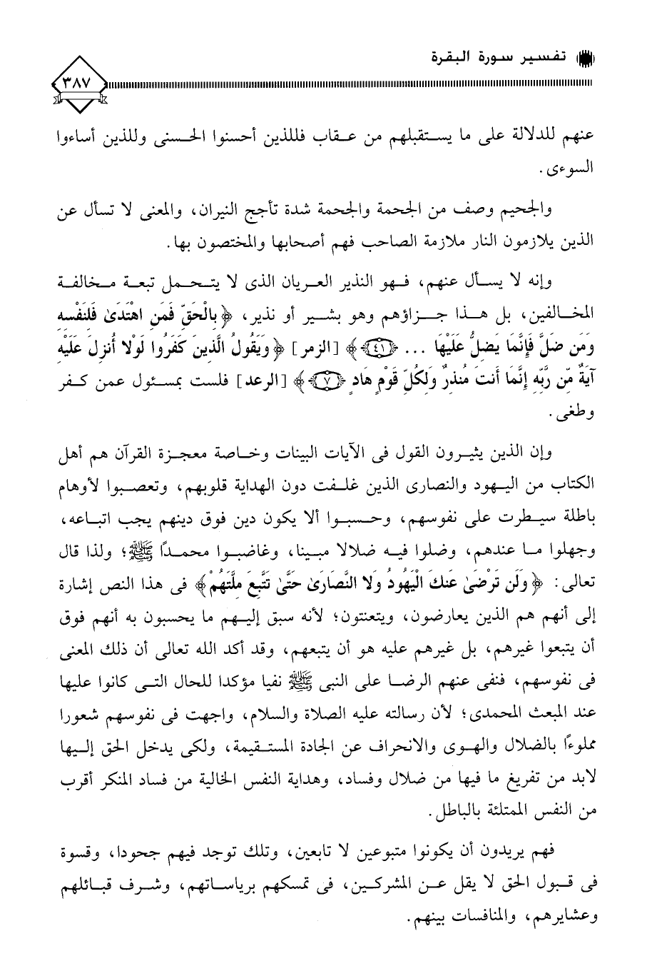 وإنه لَا يسأل عنهم، فهو النذير العريان الذي لَا يتحمل تبعة مخالفة المخالفين، بل هذا جزاؤهم وهو بشير أو نذير، (بِالْحَقِّ فَمَنِ اهْتَدَى فَلِنَفْسِهِ وَمَن ضَلَّ فَإِنَّمَا يَضِلُّ عَلَيْهَا. . .)، (وَيَقُولُ الَّذِينَ كَفَرُوا لَوْلا أُنزِلَ عَلَيْهِ آيَةٌ مِن رَّبِّهِ إِنَّمَا أَنتَ مُنذِرٌ وَلِكُلِّ قَوْمٍ هَادٍ)، فلست بمسئول عمن كفر وطغى.