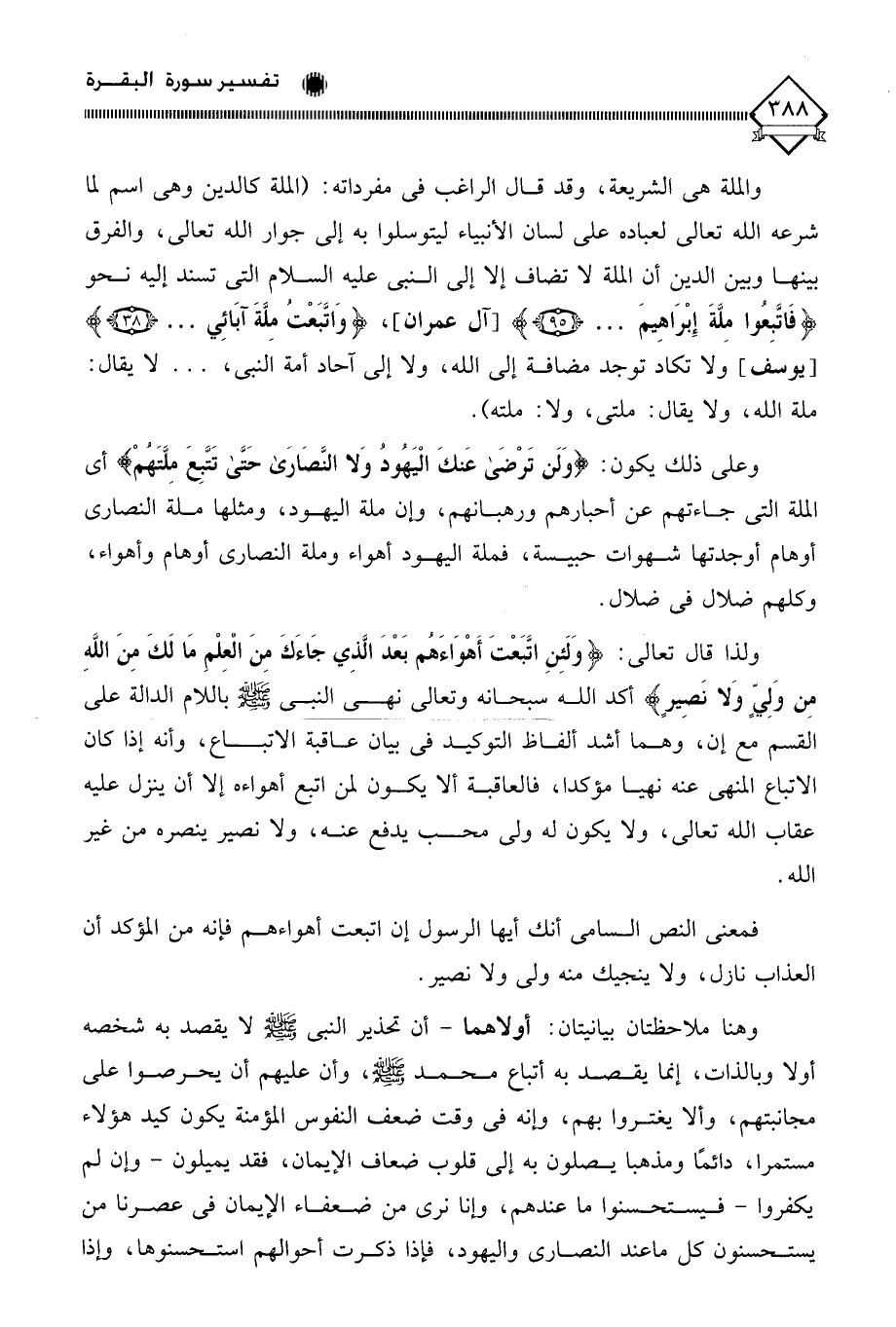 وعلى ذلك يكون: (وَلَنْ تَرْضَى عَنْكَ الْيَهُودُ وَلَا النَّصَارَى حَتَّى تَتَّبِعَ مِلَّتَهُمْ) أي الملة التي جاءتهم عن أحبارهم ورهبانهم، وإن ملة اليهود، ومثلها ملة النصارى أوهام أوجدتها شهوات حبيسة، فملة اليهود أهواء وملة النصارى أوهام وأهواء، وكلهم ضلال في ضلال.