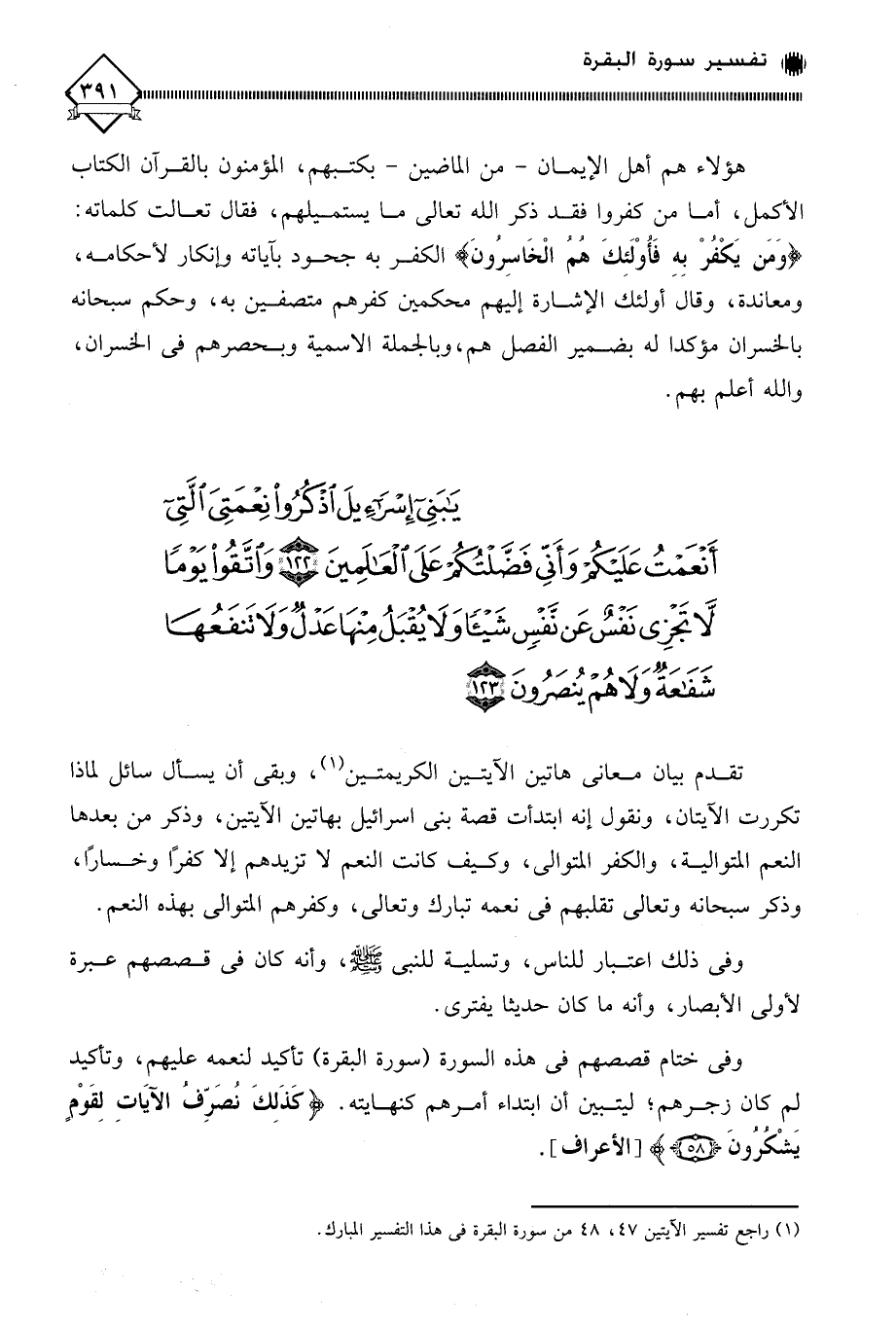 تقدم بيان معاني هاتين الآيتين الكريمتين (¬1)، وبقى أن يسأل سائل لماذا تكررت الآيتان، ونقول إنه ابتدأت قصة بني اسرائيل بهاتين الآيتين، وذكر من بعدها النعم المتوالية، والكفر المتوالي، وكيف كانت النعم لَا تزيدهم إلا كفرًا وخسارًا، وذكر سبحانه وتعالى تقلبهم في نعمه تبارك وتعالى، وكفرهم المتوالي بهذه النعم.
