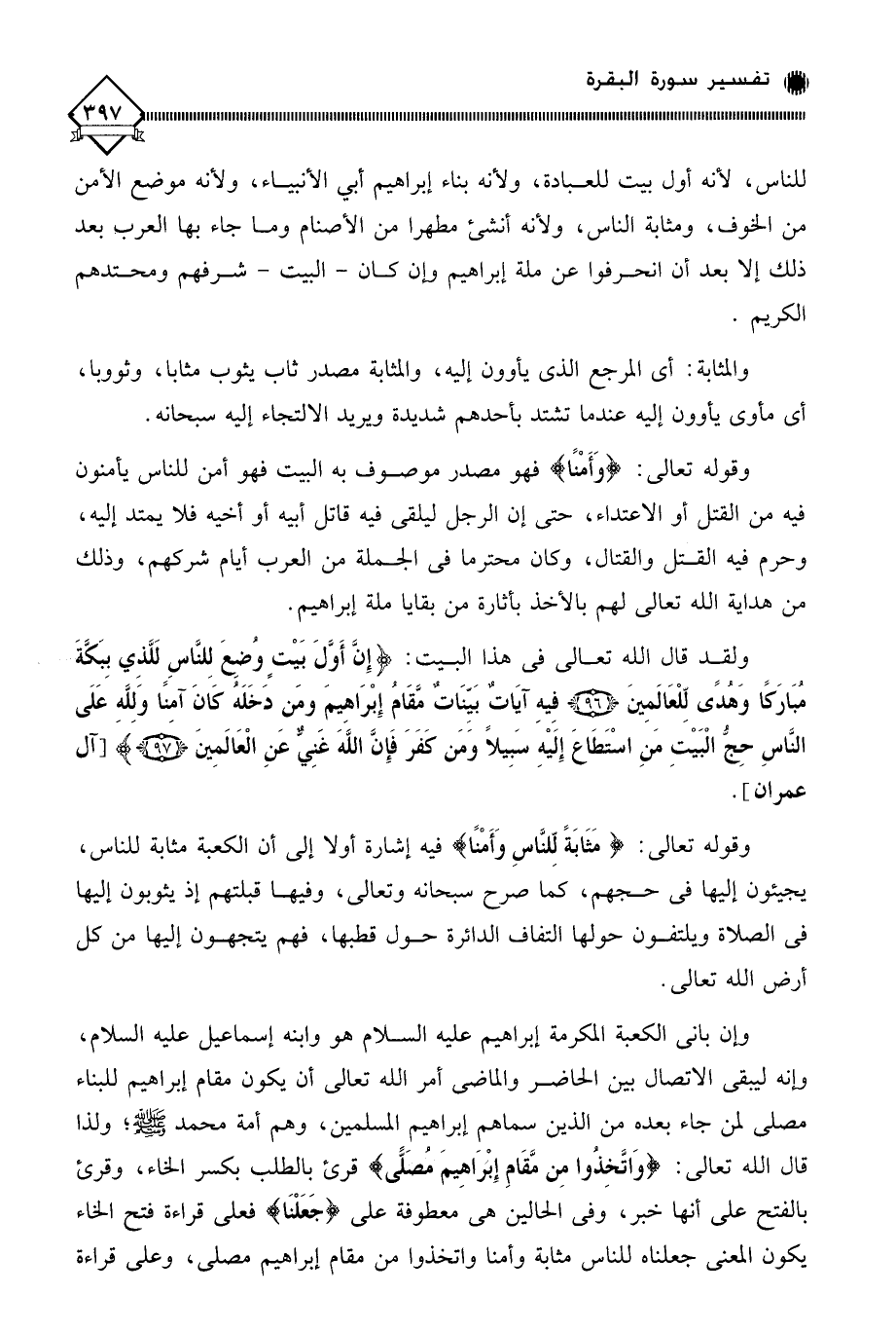 وقوله تعالى: (مَثَابَةً لِّلنَّاسِ وَأَمْنًا) فيه إشارة أولا إلى أن الكعبة مثابة للناس، يجيئون إليها في حجهم، كما صرح سبحانه وتعالى، وفيها قبلتهم إذ يثوبون إليها في الصلاة ويلتفون حولها التفاف الدائرة حول قطبها، فهم يتجهون إليها من كل أرض الله تعالى.