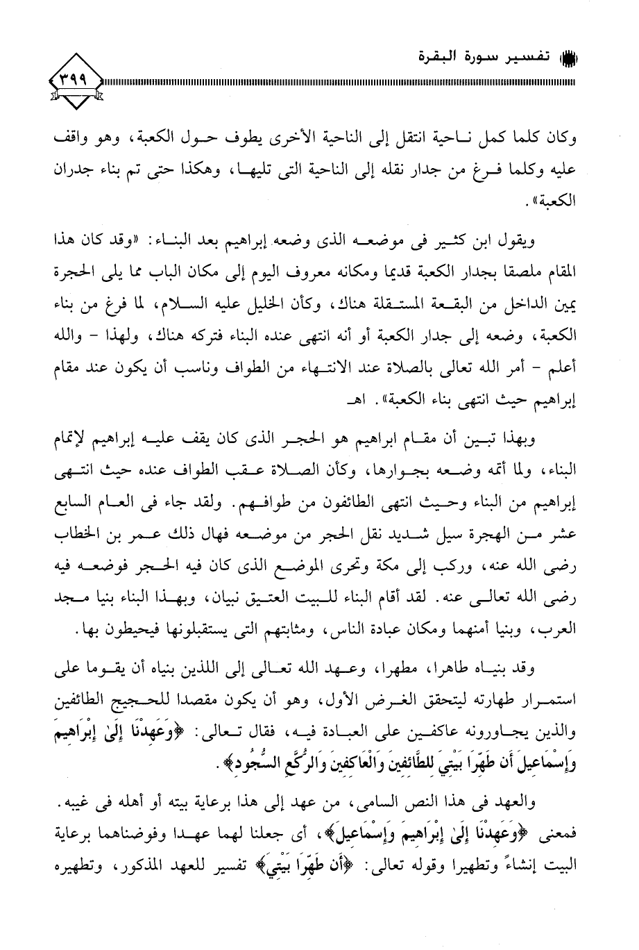 وبهذا تبين أن مقام إبراهيم هو الحجر الذي كان يقف عليه إبراهيم لإتمام البناء، ولما أتمه وضعه بجوارها، وكأن الصلاة عقب الطواف عنده حيث انتهى إبراهيم من البناء وحيث انتهى الطائفون من طوافهم. ولقد جاء في العام السابع عشر من الهجرة سيل شديد نقل الحجر من موضعه فهال ذلك عمر بن الخطاب رضي الله عنه، وركب إلى مكة وتحري الموضع الذي كان فيه الحجر فوضعه فيه رضي الله تعالى عنه. لقد أقام البناء للبيت العتيق نبيان، وبهذا البناء بنيا مجد العرب، وبنيا أمنهما ومكان عبادة الناس، ومثابتهم التي يستقبلونها فيحيطون بها.