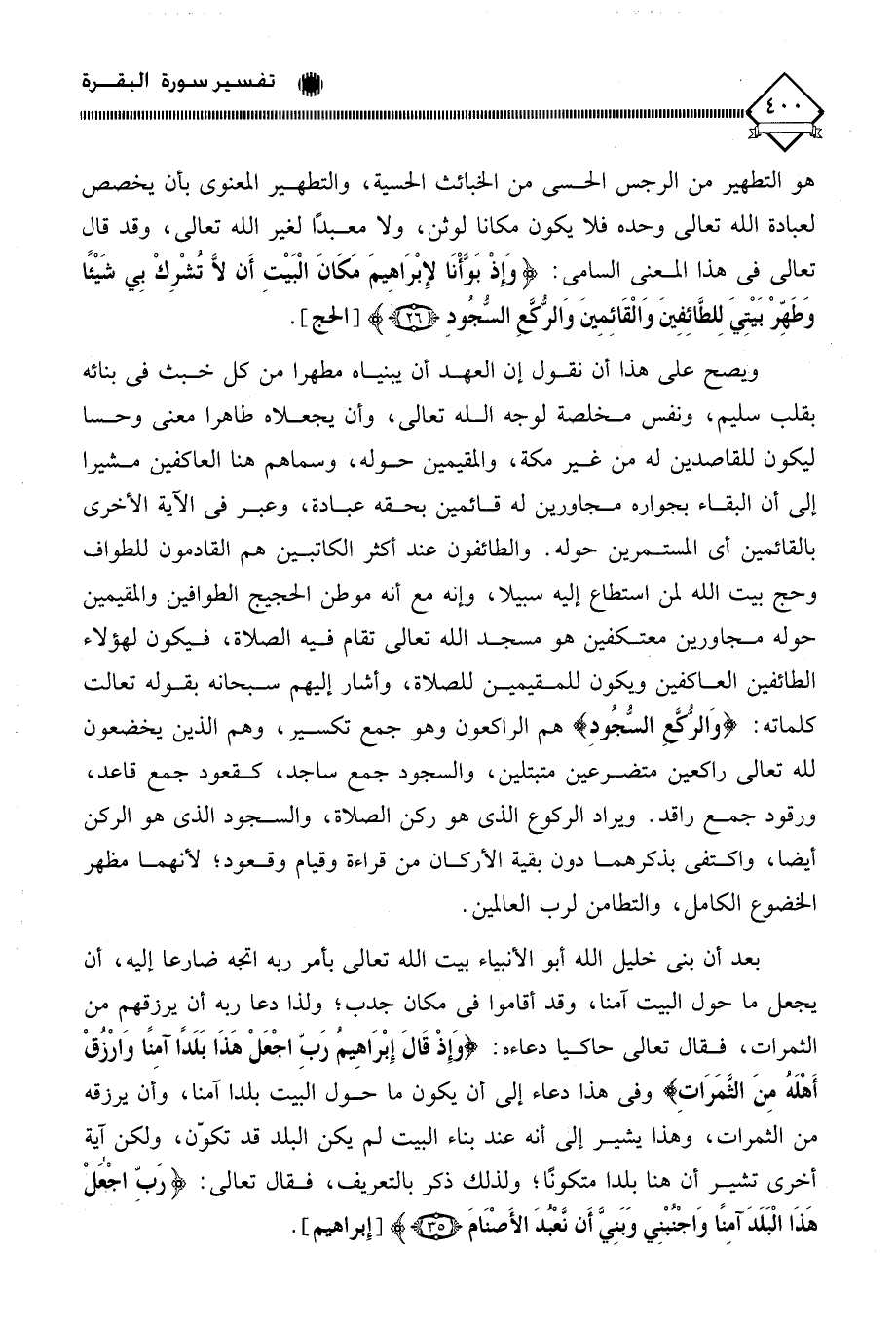 ويصح على هذا أن نقول إن العهد أن يبنياه مطهرا من كل خبث في بنائه بقلب سليم، ونفس مخلصة لوجه الله تعالى، وأن يجعلاه طاهرا معنى وحسا ليكون للقاصدين له من غير مكة، والمقيمين حوله، وسماهم هنا العاكفين مشيرا إلى أن البقاء بجواره مجاورين له قائمين بحقه عبادة، وعبر في الآية الأخرى بالقائمين أي المستمرين حوله. والطائفون عند أكثر الكاتبين هم القادمون للطواف وحج بيت الله لمن استطاع إليه سبيلا، وإنه مع أنه موطن الحجيج الطوافين والمقيمين حوله مجاورين معتكفين هو مسجد الله تعالى تقام فيه الصلاة، فيكون لهؤلاء الطائفين العاكفين ويكون للمقيمين للصلاة، وأشار إليهم سبحانه بقوله تعالت كلماته: (وَالرُّكَّعِ السُّجُودِ) هم الراكعون وهو جمع تكسير، وهم الذين يخضعون لله تعالى راكعين متضرعين متبتلين، والسجود جمع ساجد، كقعود جمع قاعد، ورقود جمع راقد. ويراد الركوع الذي هو ركن الصلاة، والسجود الذي هو الركن أيضا، واكتفى بذكرهما دون بقية الأركان من قراءة وقيام وقعود؛ لأنهما مظهر الخضوع الكامل، والتطامن لرب العالمين.