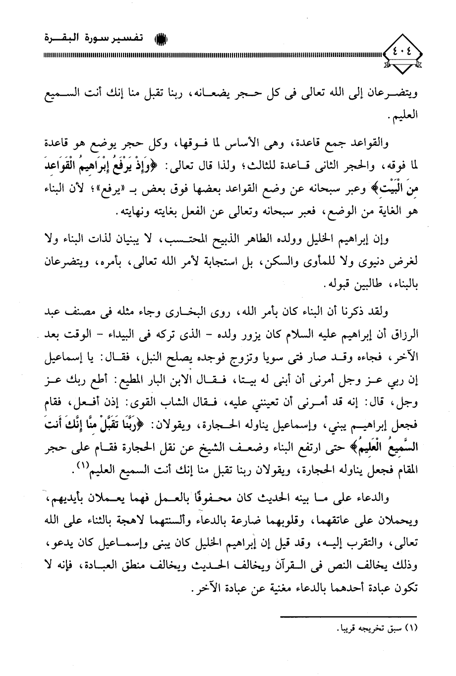 وإن إبراهيم الخليل وولده الطاهر الذبيح المحتسب، لَا يبنيان لذات البناء ولا لغرض دنيوي ولا للمأوى والسكن، بل استجابة لأمر الله تعالى، بأمره، ويتضرعان بالبناء، طالبين قبوله.