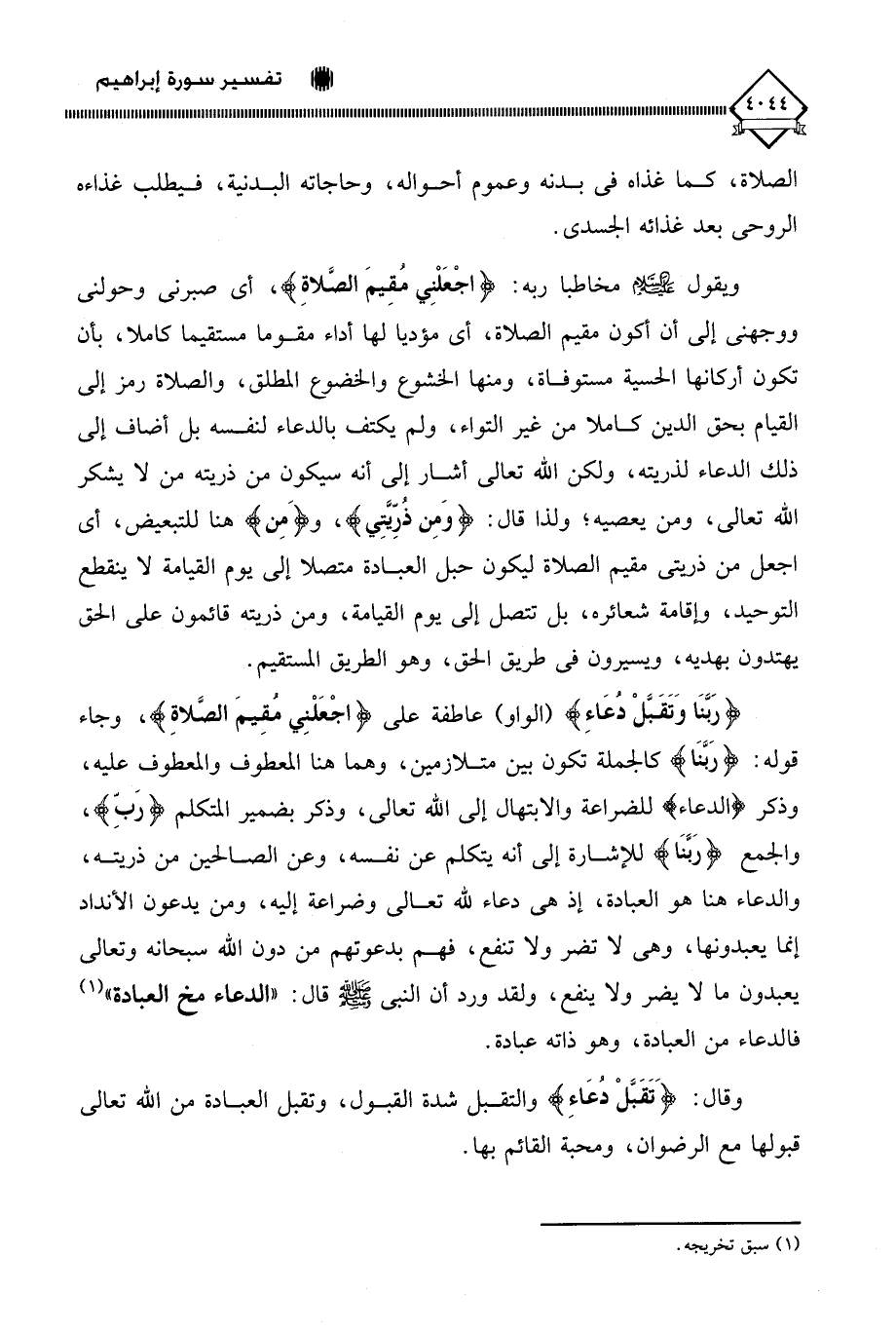 ويقول - عليه السلام - مخاطبا ربه: (اجْعَلْنِي مُقِيمَ الصَّلاةِ)، أي صيرني وحولني ووجهني إلى أن أكون مقيم الصلاة، أي مؤديا لها أداء مقوما مستقيما كاملا، بأن تكون أركانها الحسية مستوفاة، ومنها الخشوع والخضوع المطلق، والصلاة رمز إلى القيام بحق الدين كاملا من غير التواء، ولم يكتف بالدعاء لنفسه بل أضاف إلى ذلك الدعاء لذريته، ولكن اللَّه تعالى أشار إلى أنه سيكون من ذريته من لَا يشكر اللَّه تعالى، ومن يعصيه، ولذا قال: (وَمِن ذُرِّيَّتِي)، و (مِن) هنا للتبعيض، أي اجعل من ذريتي مقيم الصلاة ليكون حبل العبادة متصلا إلى يوم القيامة لَا ينقطع التوحيد، وإقامة شعائره، بل تتصل إلى يوم القيامة، ومن ذريته قائمون على الحق يهتدون بهديه، ويسيرون في طريق الحق، وهو الطريق المستقيم.