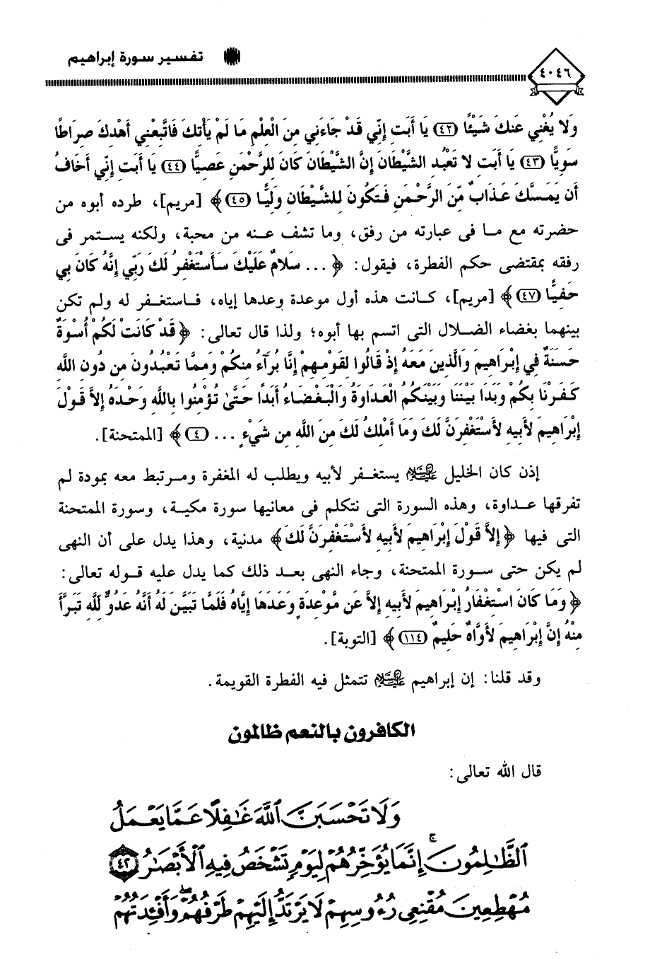 إذن كان الخليل - صلى الله عليه وسلم - يستغفر لأبيه ويطلب له المغفرة ومرتبط معه بمودة لم تفرقها عداوة، وهذه السورة التي نتكلم في معانيها سورة مكية، وسورة الممتحنة التي فيها (إِلَّا قَوْلَ إِبْرَاهِيمَ لأَبِيهِ لأَسْتَغْفِرَنً لَكَ) مدنية، وهذا يدل على أن النهي لم يكن حتى سورة الممتحنة، وجاء النهي بعد ذلك كما يدل عليه قوله تعالى: