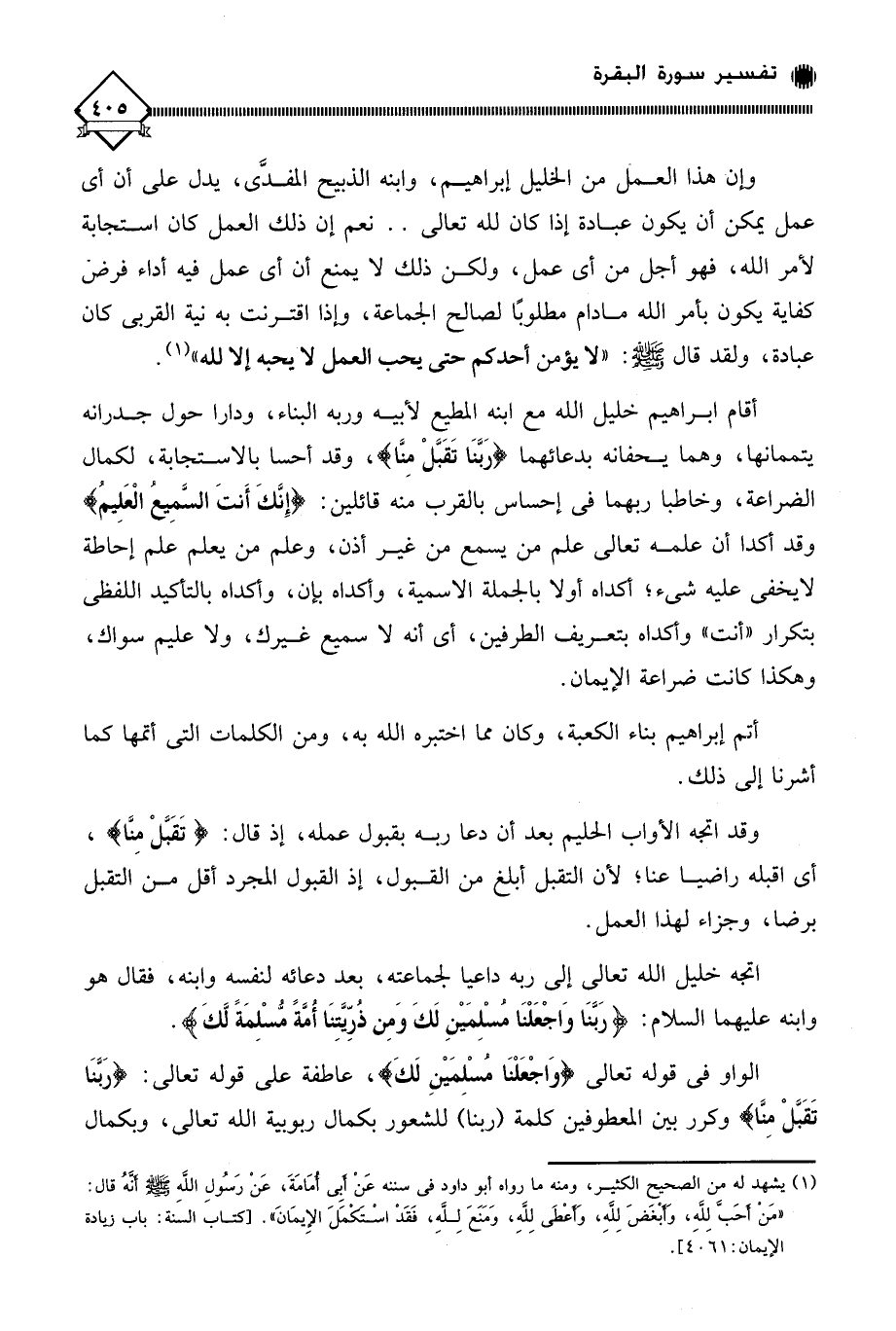 أقام إبراهيم خليل الله مع ابنه المطيع لأبيه وربه البناء، ودارا حول جدرانه يتممانها، وهما يحفانه بدعائهما (رَبَّنَا تَقَبَّلْ مِنَّا)، وقد أحسا بالاستجابة، لكمال الضراعة، وخاطبا ربهما في إحساس بالقرب منه قائلين: (إِنَّكَ أَنتَ السَّمِيعُ الْعَلِيمُ) وقد أكدا أن علمه تعالى علم من يسمع من غير أذن، وعلم من يعلم علم إحاطة لا يخفى عليه شيء؛ أكداه أولا بالجملة الاسمية، وأكداه بإن، وأكداه بالتأكيد اللفظي بتكرار " أنت " وأكداه بتعريف الطرفين، أي أنه لَا سميع غيرك، ولا عليم سواك، وهكذا كانت ضراعة الإيمان.