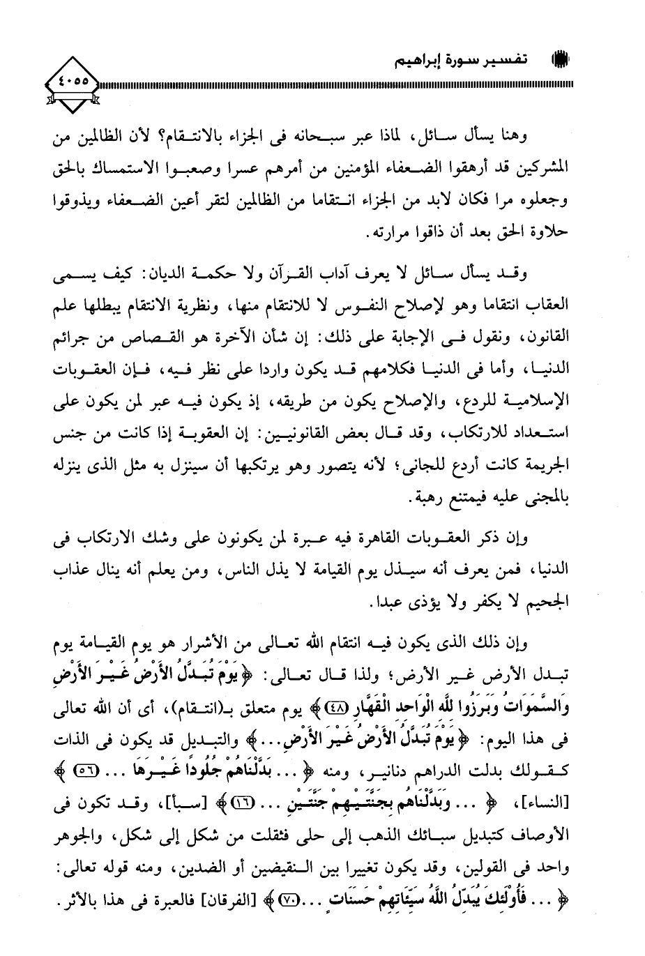 وقد يسأل سائل لَا يعرف آداب القرآن ولا حكمة الديان: كيف يسمى العقاب انتقاما وهو لإصلاح النفوس لَا للانتقام منها، ونظرية الانتقام يبطلها علم القانون، ونقول في الإجابة على ذلك: إن شأن الآخرة هو القصاص من جرائم الدنيا، وأما في الدنيا فكلامهم قد يكون واردا على نظر فيه، فإن العقوبات الإسلامية للردع، والإصلاح يكون من طريقه، إذ يكون فيه عبر لمن يكون على استعداد للارتكاب، وقد قال بعض القانونيين: إن العقوبة إذا كانت من جنس الجريمة كانت أردع للجاني؛ لأنه يتصور وهو يرتكبها أن سينزل به مثل الذي ينزله بالمجني عليه فيمتنع رهبة.