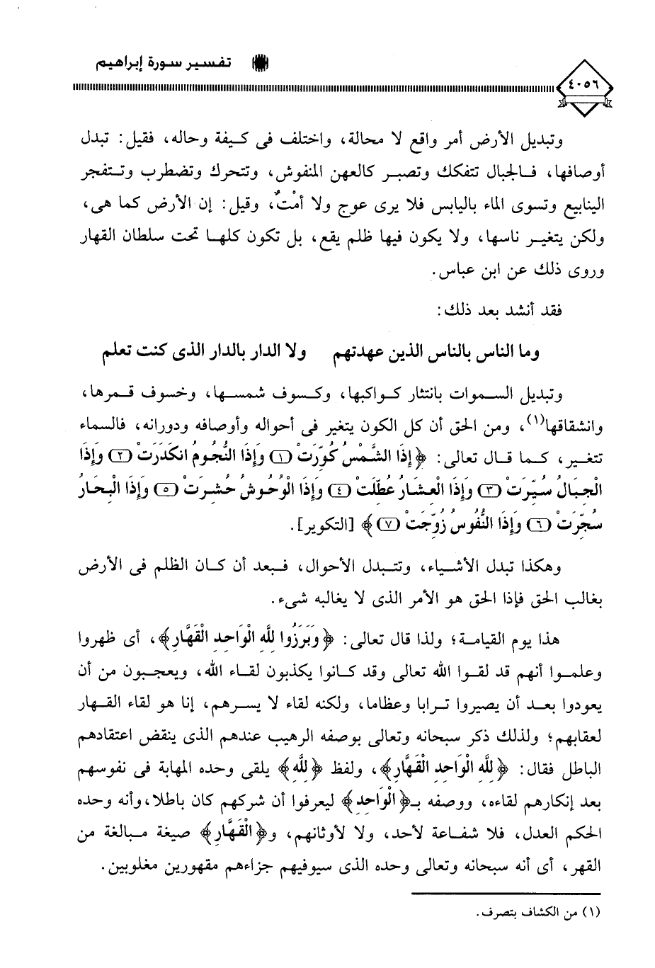 وما الناس بالناس الذين عهدتهم ... ولا الدار بالدار الذي كنت تعلم وتبديل السماوات بانتثار كواكبها، وكسوف شمسها، وخسوف قمرها، وانشقاقها (¬1)، ومن الحق أن كل الكون يتغير في أحواله وأوصافه ودورانه، فالسماء تتغير، كما قال تعالى: (إِذَا الشَّمْسُ كُوِّرَتْ (1) وَإِذَا النُّجُومُ انْكَدَرَتْ (2) وَإِذَا الْجِبَالُ سُيِّرَتْ (3) وَإِذَا الْعِشَارُ عُطِّلَتْ (4) وَإِذَا الْوُحُوشُ حُشِرَتْ (5) وَإِذَا الْبِحَارُ سُجِّرَتْ (6) وَإِذَا النُّفُوسُ زُوِّجَتْ (7).