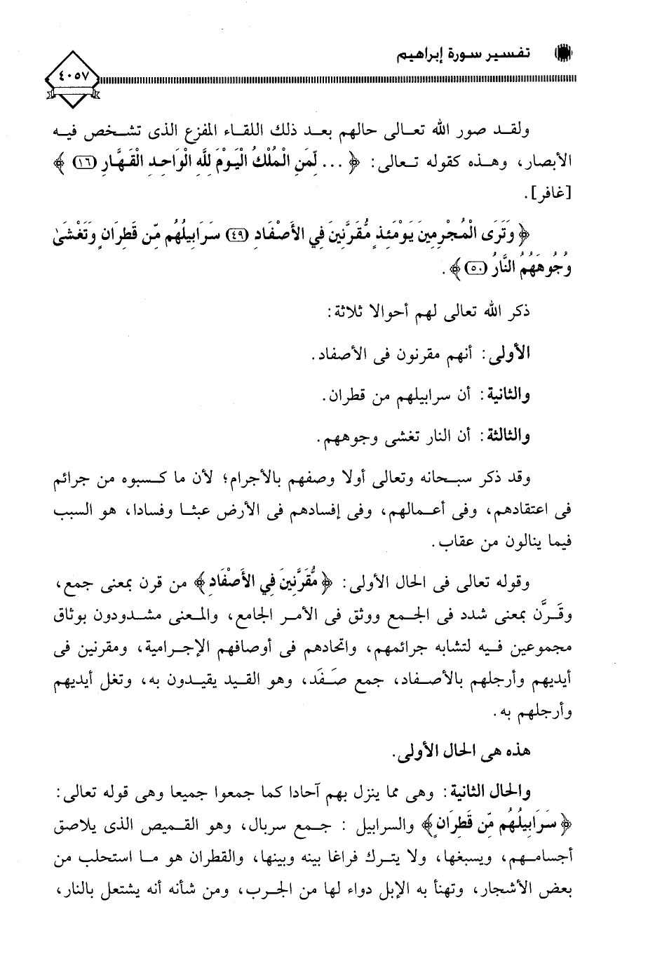 (وَتَرَى الْمُجْرِمِينَ يَوْمَئِذٍ مُقَرَّنِينَ فِي الْأَصْفَادِ (49) سَرَابِيلُهُمْ مِنْ قَطِرَانٍ وَتَغْشَى وُجُوهَهُمُ النَّارُ (50)