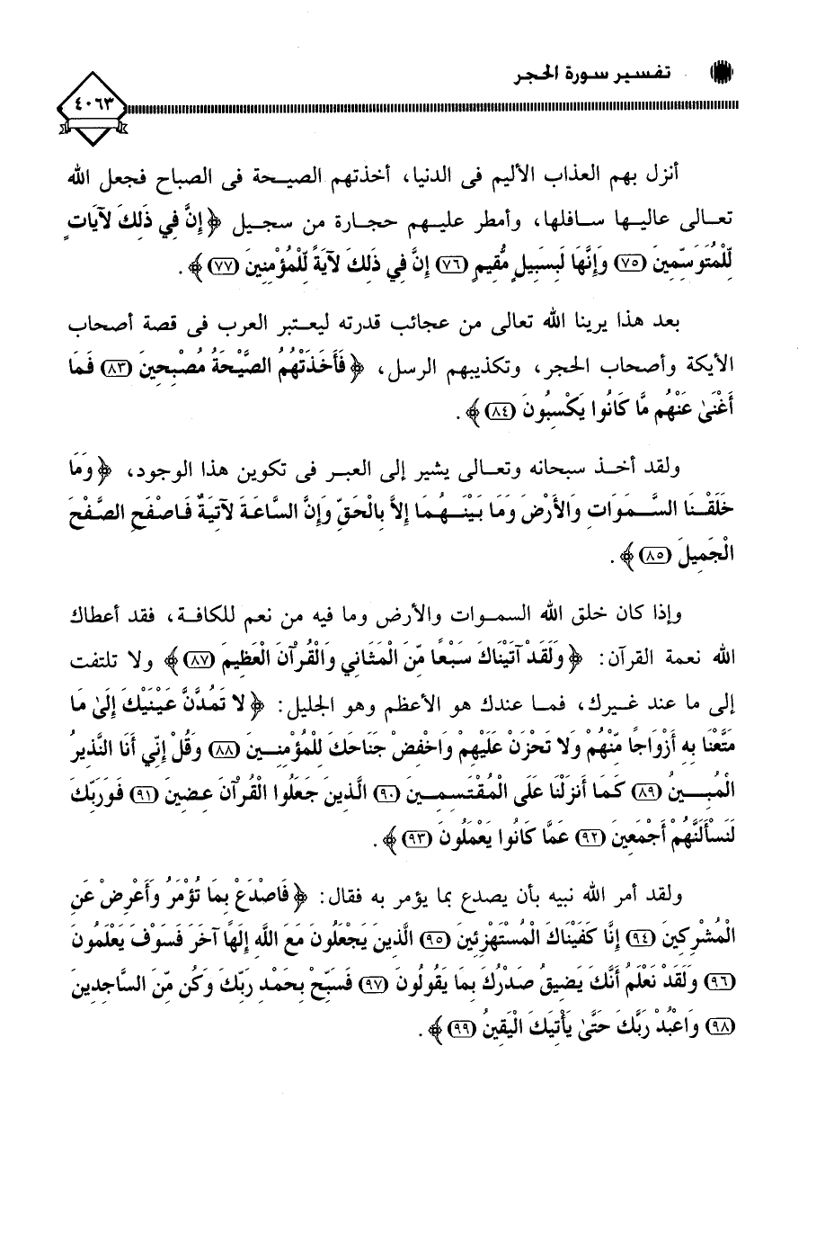 بعد هذا يرينا اللَّه تعالى من عجائب قدرته ليعتبر العرب في قصة أصحاب الأيكة وأصحاب الحجر، وتكذيبهم الرسل، (فَأَخَذَتْهُمُ الصَّيْحَةُ مُصْبِحِينَ (83) فَمَا أَغْنَى عَنْهُمْ مَا كَانُوا يَكْسِبُونَ (84).