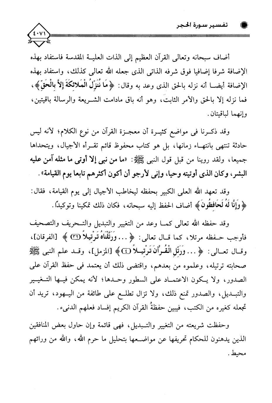 أضاف سبحانه وتعالى القرآن العظيم إلى الذات العلية المقدسة فاستفاد بهذه الإضافة شرفا إضافيا فوق شرفه الذاتي الذي جعله اللَّه تعالى كذلك، واستفاد بهذه الإضافة أيضا أنه نزله بالحق الذي وعد به وقال: (مَا نُنَزِّلُ الْمَلَائِكَةَ إِلَّا بِالْحَقِّ)، فما نزله إلا بالحق والأمر الثابت، وهو أنه باق ما دامت الشريعة والرسالة باقيتين، وإنهما لباقيتان.