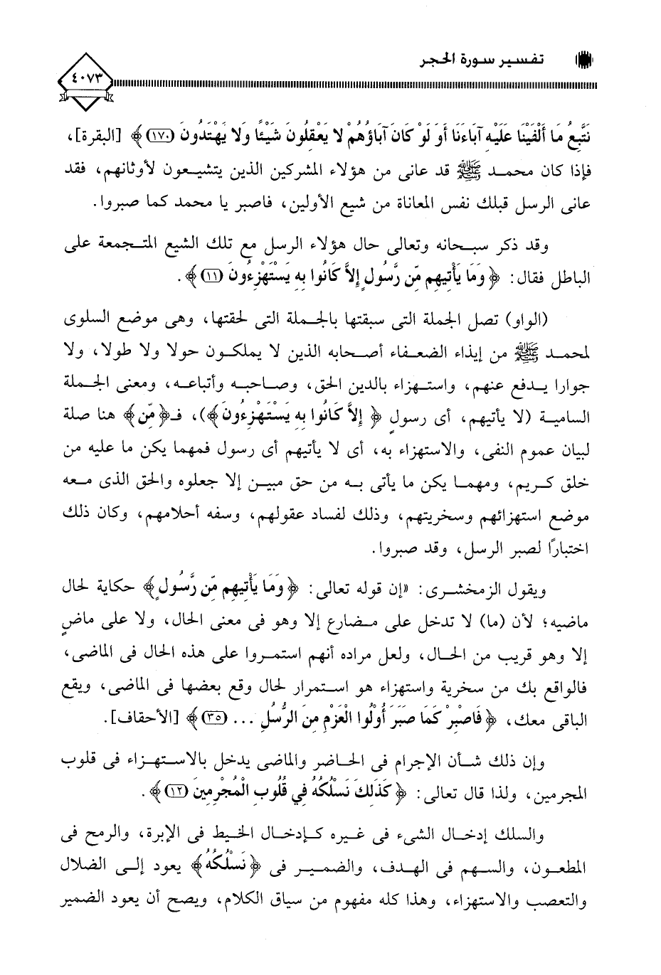 (وَمَا يَأْتِيهِمْ مِنْ رَسُولٍ إِلَّا كَانُوا بِهِ يَسْتَهْزِءُونَ (11) (الواو) تصل الجملة التي سبقتها بالجملة التي لحقتها، وهي موضع السلوى لمحمد - صلى الله عليه وسلم - من إيذاء الضعفاء أصحابه الذين لَا يملكون حولا ولا طولا، ولا جوارا يدفع عنهم، واستهزاء بالدين الحق، وصاحبه وأتباعه، ومعنى الجملة السامية (لا يأتيهم، أي رسولي (إِلَّا كَانُوا بِهِ يَسْتَهْزِءُونَ))، فـ (مِّن) هنا صلة لبيان عموم النفي، والاستهزاء به، أي لَا يأتيهم أي رسول فمهما يكن ما عليه من خلق كريم، ومهما يكن ما يأتي به من حق مبين إلا جعلوه والحق الذي معه موضع استهزائهم وسخريتهم، وذلك لفساد عقولهم، وسفه أحلامهم، وكان ذلك اختبارًا لصبر الرسل، وقد صبروا.