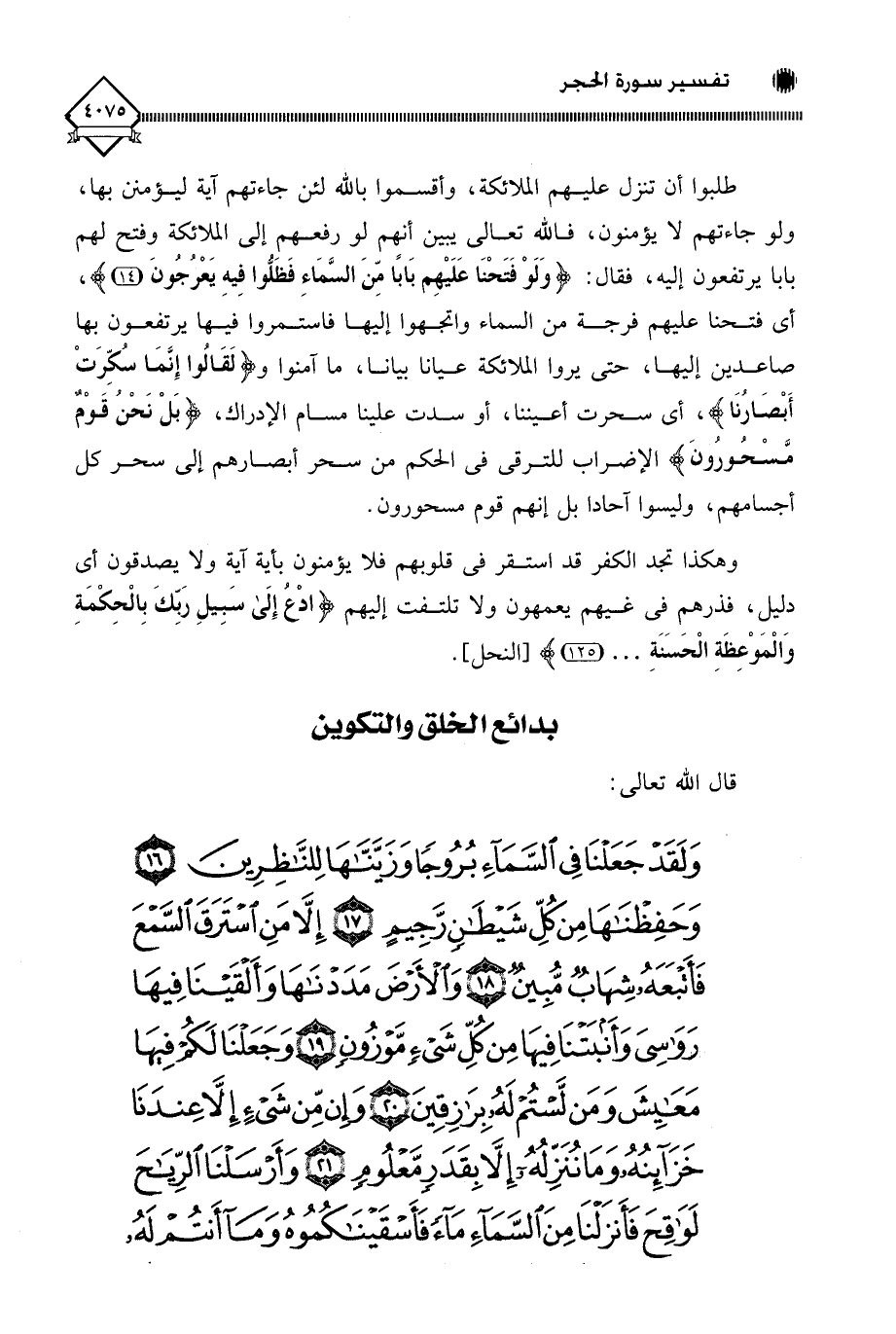 (وَلَقَدْ جَعَلْنَا فِي السَّمَاءِ بُرُوجًا وَزَيَّنَّاهَا لِلنَّاظِرِينَ (16) وَحَفِظْنَاهَا مِنْ كُلِّ شَيْطَانٍ رَجِيمٍ (17) إِلَّا مَنِ اسْتَرَقَ السَّمْعَ فَأَتْبَعَهُ شِهَابٌ مُبِينٌ (18) وَالْأَرْضَ مَدَدْنَاهَا وَأَلْقَيْنَا فِيهَا رَوَاسِيَ وَأَنْبَتْنَا فِيهَا مِنْ كُلِّ شَيْءٍ مَوْزُونٍ (19) وَجَعَلْنَا لَكُمْ فِيهَا مَعَايِشَ وَمَنْ لَسْتُمْ لَهُ بِرَازِقِينَ (20) وَإِنْ مِنْ شَيْءٍ إِلَّا عِنْدَنَا خَزَائِنُهُ وَمَا نُنَزِّلُهُ إِلَّا بِقَدَرٍ مَعْلُومٍ (21) وَأَرْسَلْنَا الرِّيَاحَ لَوَاقِحَ فَأَنْزَلْنَا مِنَ السَّمَاءِ مَاءً فَأَسْقَيْنَاكُمُوهُ وَمَا أَنْتُمْ لَهُ