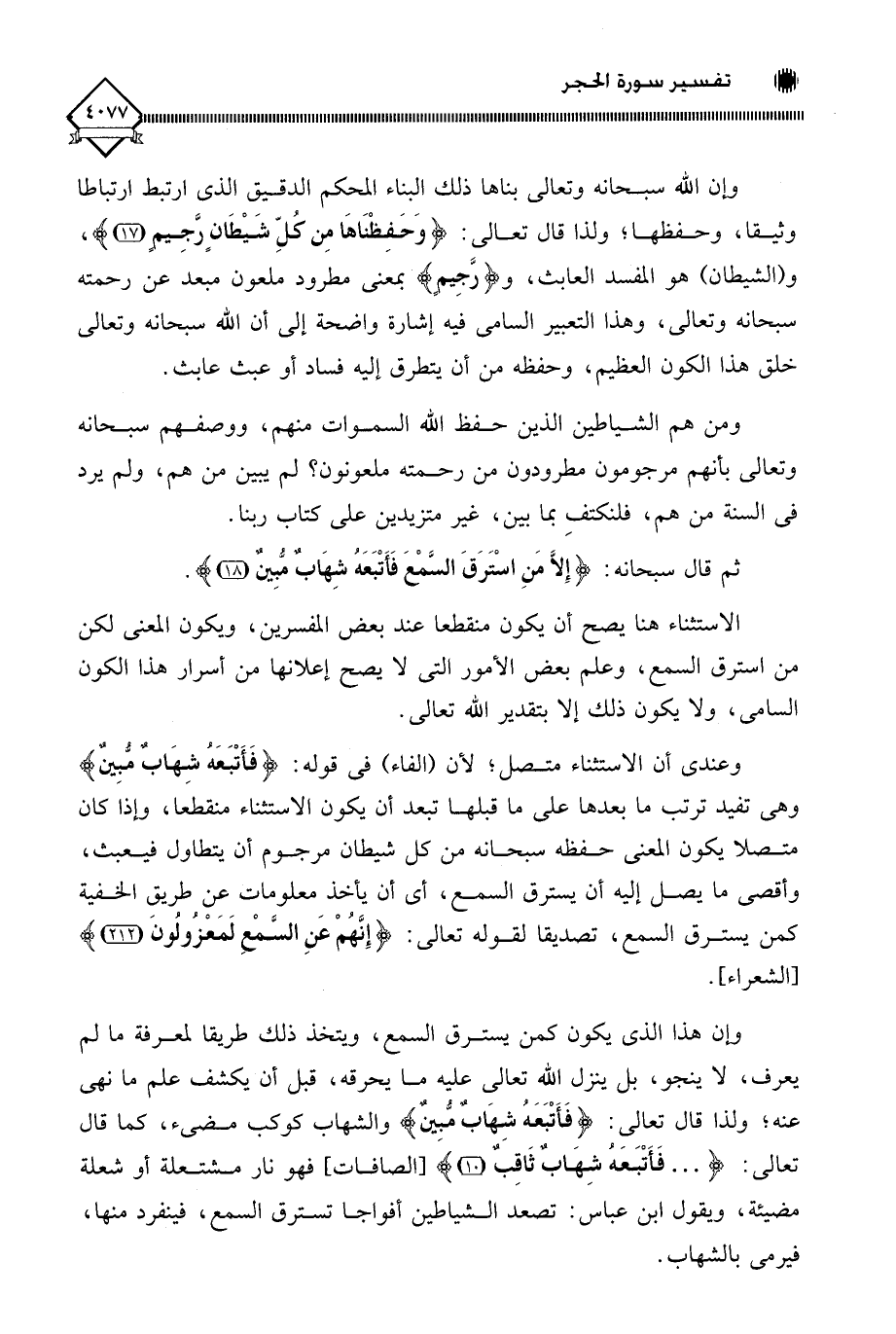 الاستثناء هنا يصح أن يكون منقطعا عند بعض المفسرين، ويكون المعنى لكن من استرق السمع، وعلم بعض الأمور التي لَا يصح إعلانها من أسرار هذا الكون السامي، ولا يكون ذلك إلا بتقدير اللَّه تعالى.
