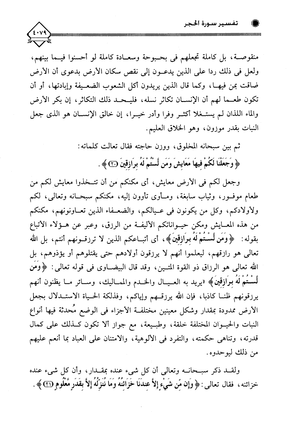 منقوصة، بل كاملة تجعلهم في بحبوحة وسعادة كاملة لو أحسنوا فيما بينهم، ولعل في ذلك ردا على الذين يدعون إلى نقص سكان الأرض بدعوى أن الأرض ضاقت بمن فيها، وكما قال الذين يريدون أكل الشعوب الضعيفة وإبادتها، أو أن تكون طعما لهم أن الإنسان تكاثر نسله، فليحد ذلك التكاثر، إن بكر الأرض والماء اللذان لم يستغلا أكثر وفرا وأدر خيرا، إن خالق الإنسان هو الذي جعل النبات بقدر موزون، وهو الخلاق العليم.