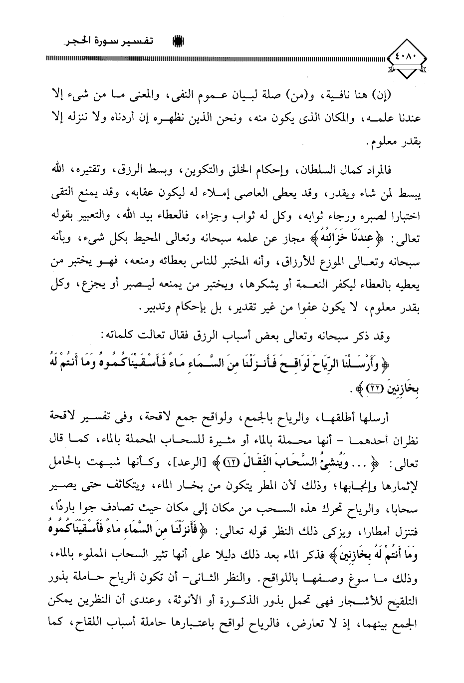 أرسلها أطلقها، والرياح بالجمع، ولواقح جمع لاقحة، وفي تفسير لاقحة نظران أحدهما - أنها محملة بالماء أو مثيرة للسحاب المحملة بالماء، كما قال تعالى: (. . . وَيُنشِئُ السَّحَابَ الثِّقَالَ)، وكأنها شبهت بالحامل لإثمارها وإنجابها؛ وذلك لأن المطر يتكون من بخار الماء، ويتكاثف حتى يصير سحابا، والرياح تحرك هذه السحب من مكان إلى مكان حيث تصادف جوا باردًا، فتنزل أمطارا، ويزكي ذلك النظر قوله تعالى: (فَأَنْزَلْنَا مِنَ السَّمَاءِ مَاءً فَأَسْقَيْنَاكُمُوهُ وَمَا أَنْتُمْ لَهُ بِخَازِنِينَ) فذكر الماء بعد ذلك دليلا على أنها تثير السحاب المملوء بالماء، وذلك ما سوغ وصفها باللواقح. والنظر الثاني - أن تكون الرياح حاملة بذور التلقيح للأشجار فهي تحمل بذور الذكورة أو الأنوثة، وعندي أن النظرين يمكن الجمع بينهما، إذ لَا تعارض، فالرياح لواقح باعتبارها حاملة أسباب اللقاح، كما