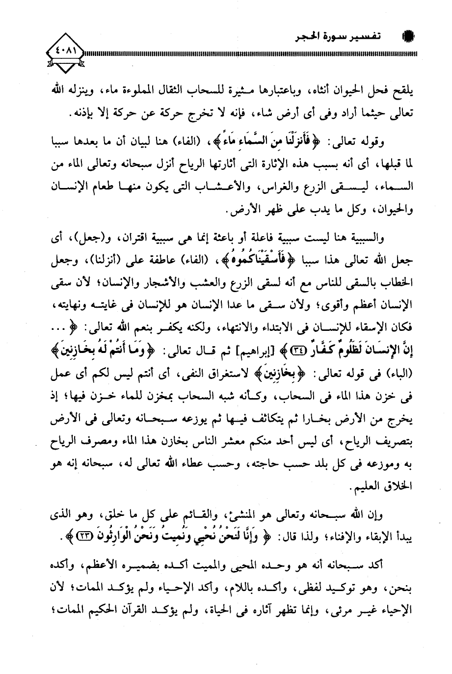 والسببية هنا ليست سببية فاعلة أو باعثة إنما هي سببية اقترأن، و (جعل)، أي جعل الله قعالى هذا سببا (فَأَسْقَيْنَاكُمُوهُ)، (الفاء) عاطفة على (أنزلنا)، وجعل الخطاب بالسقي للناس مع أنه لسقي الزرع والعشب والأشجار والإنسان؛ لأن سقي الإنسان أعظم وأقوى؛ ولأن سقي ما عدا الإنسان هو للإنسان في غايته ونهايته، فكان الإسقاء للإنسان في الابتداء والانتهاء، ولكنه يكفر بنعِم اللَّه تعالى: (. . . إِنَّ الْإِنْسَانَ لَظَلُومٌ كَفَّارٌ)، ثم قال تعالى: (ومَا أَنتُمْ لَهُ بخَازِنِينَ) (الباء) في قوله تعالى: (بِخَازِنِينَ) لاستغراق النفي، أي أنتم ليس لكم أي عمل في خزن هذا الماء في السحاب، وكأنَّه شبه السحاب بمخزن للماء خزن فيها؛ إذ يخرج من الأرض بخارا ثم يتكاثف فيها ثم يوزعه سبحانه وتعالى في الأرض بتصريف الرياح، أي ليس أحد منكم معشر الناس بخازن هذا الماء ومصرف الرياح به وموزعه في كل بلد حسب حاجته، وحسب عطاء اللَّه تعالى له، سبحانه إنه هو الخلاق العليم.