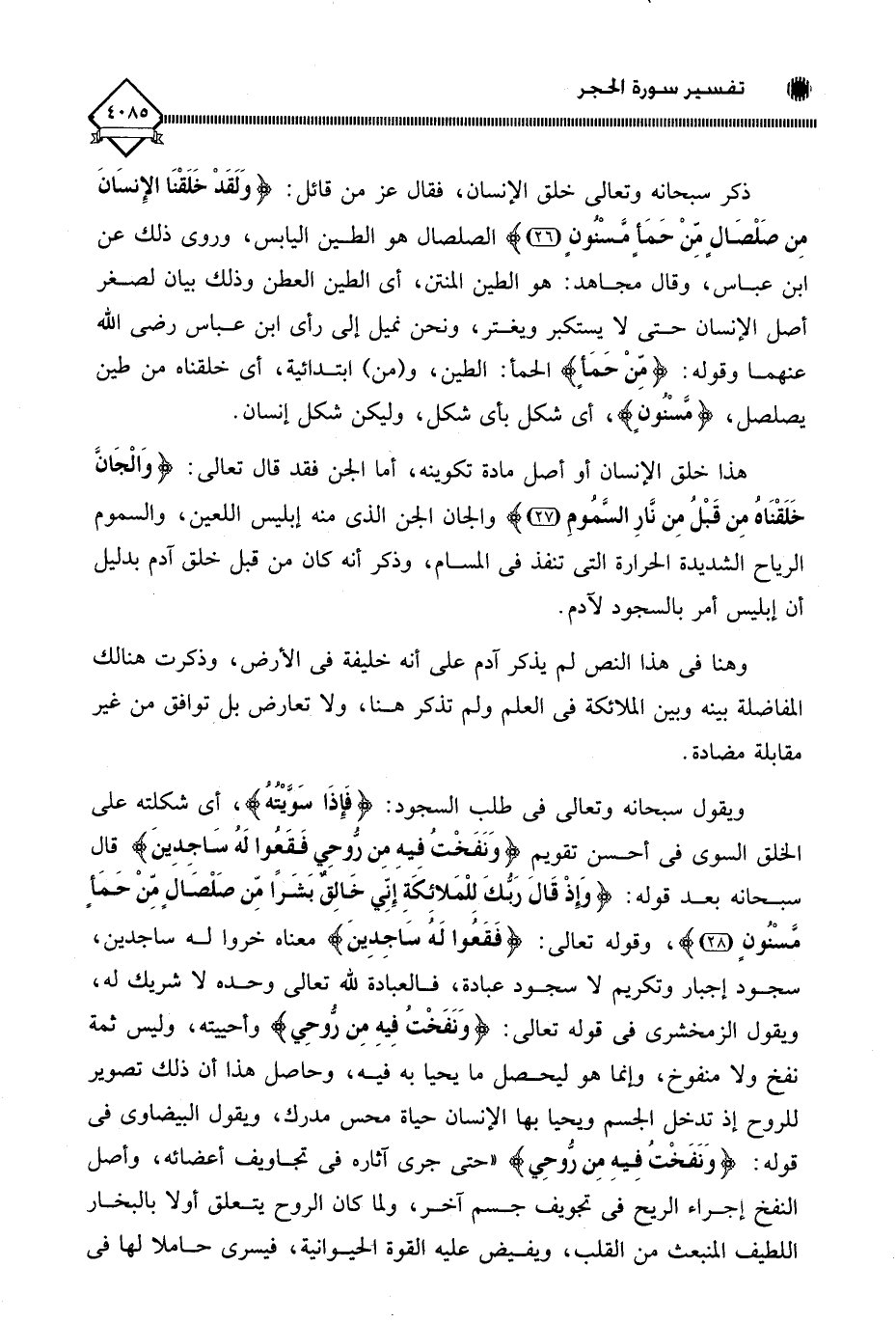 (وَإِذْ قَالَ رَبُّكَ لِلْمَلَائِكَةِ إِنِّي خَالِقٌ بَشَرًا مِنْ صَلْصَالٍ مِنْ حَمَإٍ مَسْنُونٍ)، وقوله تعالى: (فَقَعُوا لَهُ سَاجِدِينَ) معناه خروا له ساجدين، سجود إجبار وتكريم لَا سجود عبادة، فالعبادة لِلَّهِ تعالى وحده لَا شريك له، ويقول الزمخشري في قوله تعالى: (وَنَفَخْتُ فِيهِ مِن رُّوحِي) وأحييته، وليس ثمة نفخ ولا منفوخ، وإنما هو ليحصل ما يحيا به فيه، وحاصل هذا أن ذلك تصوير للروح إذ تدخل الجسم ويحيا بها الإنسان حياة محس مدرك، ويقول البيضاوي في قوله: (وَنَفَخْتُ فِيهِ مِن رُّوحِي) " حتى جرى آثاره في تجاويف أعضائه، وأصل النفخ إجراء الريح في تجويف جسم آخر، ولما كان الروح يتعلق أولا بالبخار اللطيف المنبعث من القلب، ويفيض عليه القوة الحيوانية، فيسري حاملا لها في