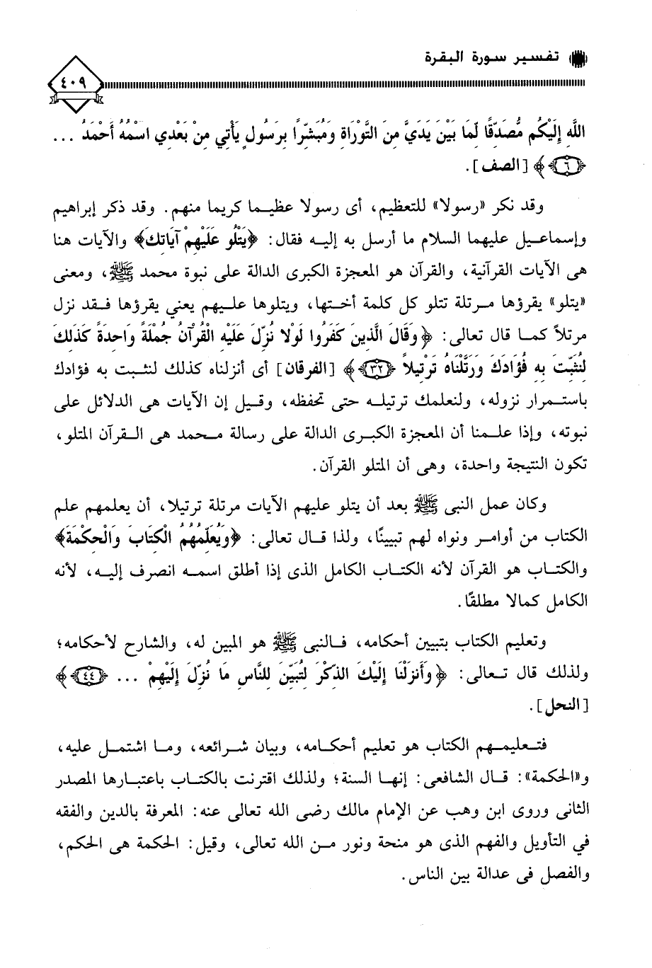 وتعليم الكتاب بتبيين أحكامه، فالنبي - صلى الله عليه وسلم - هو المبين له، والشارح لأحكامه؛ ولذلك قال تعالى: (وَأَنزَلْنَا إِلَيْكَ الذكرَ لِتبَيِّنَ لِلنَّاسِ مَا نُزِّلَ إِلَيْهِمْ. . .).