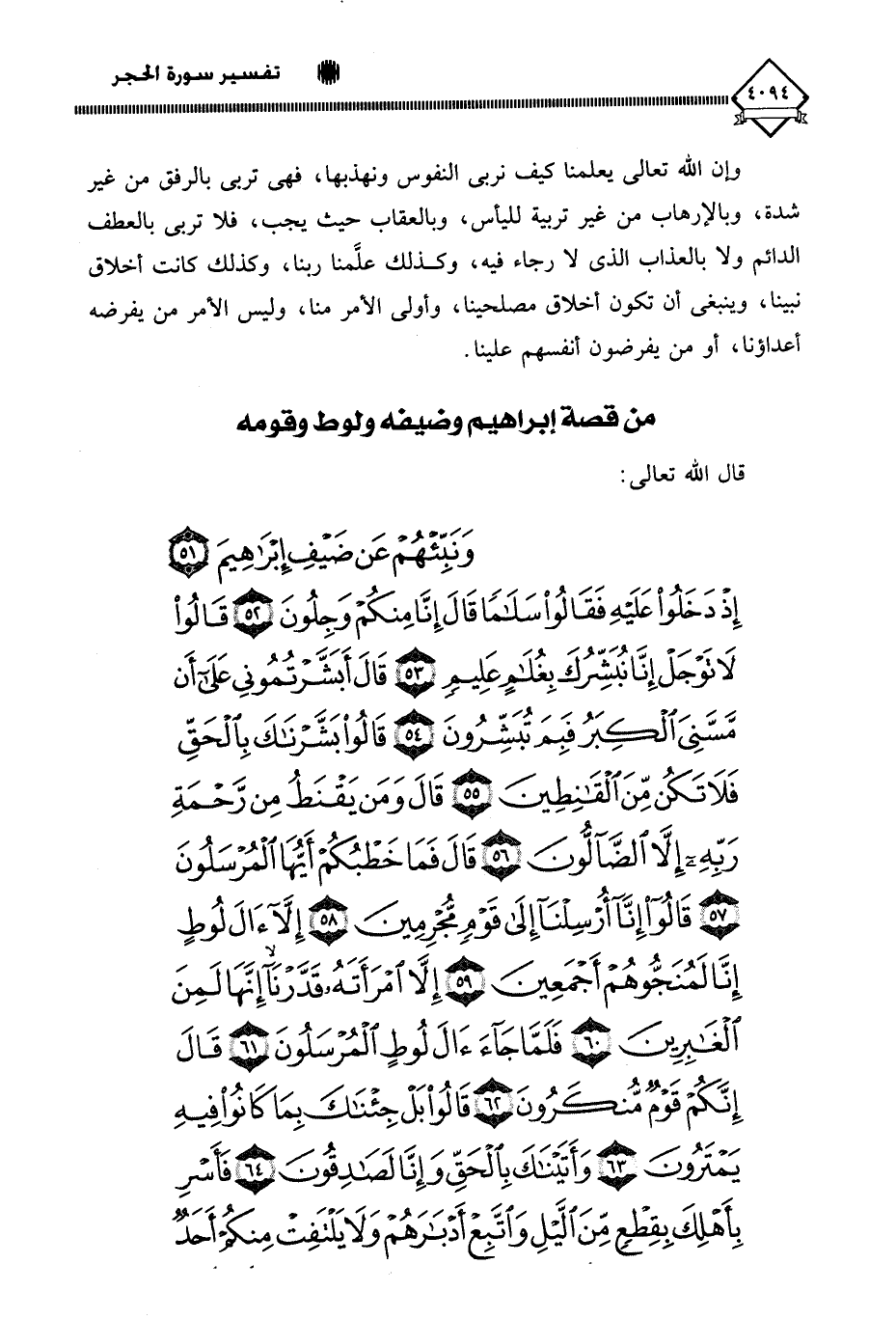 (وَنَبِّئْهُمْ عَنْ ضَيْفِ إِبْرَاهِيمَ (51) إِذْ دَخَلُوا عَلَيْهِ فَقَالُوا سَلَامًا قَالَ إِنَّا مِنْكُمْ وَجِلُونَ (52) قَالُوا لَا تَوْجَلْ إِنَّا نُبَشِّرُكَ بِغُلَامٍ عَلِيمٍ (53) قَالَ أَبَشَّرْتُمُونِي عَلَى أَنْ مَسَّنِيَ الْكِبَرُ فَبِمَ تُبَشِّرُونَ (54) قَالُوا بَشَّرْنَاكَ بِالْحَقِّ فَلَا تَكُنْ مِنَ الْقَانِطِينَ (55) قَالَ وَمَنْ يَقْنَطُ مِنْ رَحْمَةِ رَبِّهِ إِلَّا الضَّالُّونَ (56) قَالَ فَمَا خَطْبُكُمْ أَيُّهَا الْمُرْسَلُونَ (57) قَالُوا إِنَّا أُرْسِلْنَا إِلَى قَوْمٍ مُجْرِمِينَ (58) إِلَّا آلَ لُوطٍ إِنَّا لَمُنَجُّوهُمْ أَجْمَعِينَ (59) إِلَّا امْرَأَتَهُ قَدَّرْنَا إِنَّهَا لَمِنَ الْغَابِرِينَ (60) فَلَمَّا جَاءَ آلَ لُوطٍ الْمُرْسَلُونَ (61) قَالَ إِنَّكُمْ قَوْمٌ مُنْكَرُونَ (62) قَالُوا بَلْ جِئْنَاكَ بِمَا كَانُوا فِيهِ يَمْتَرُونَ (63) وَأَتَيْنَاكَ بِالْحَقِّ وَإِنَّا لَصَادِقُونَ (64) فَأَسْرِ بِأَهْلِكَ بِقِطْعٍ مِنَ اللَّيْلِ وَاتَّبِعْ أَدْبَارَهُمْ وَلَا يَلْتَفِتْ مِنْكُمْ أَحَدٌ