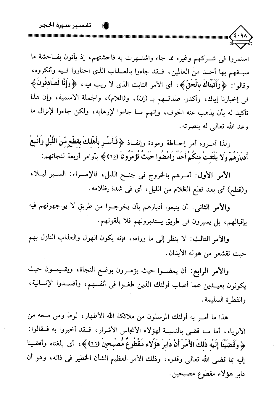 (فَأَسْرِ بِأَهْلِكَ بِقِطْعٍ مِنَ اللَّيْلِ وَاتَّبِعْ أَدْبَارَهُمْ وَلَا يَلْتَفِتْ مِنْكُمْ أَحَدٌ وَامْضُوا حَيْثُ تُؤْمَرُونَ (65) بأوامر أربعة لنجاتهم: