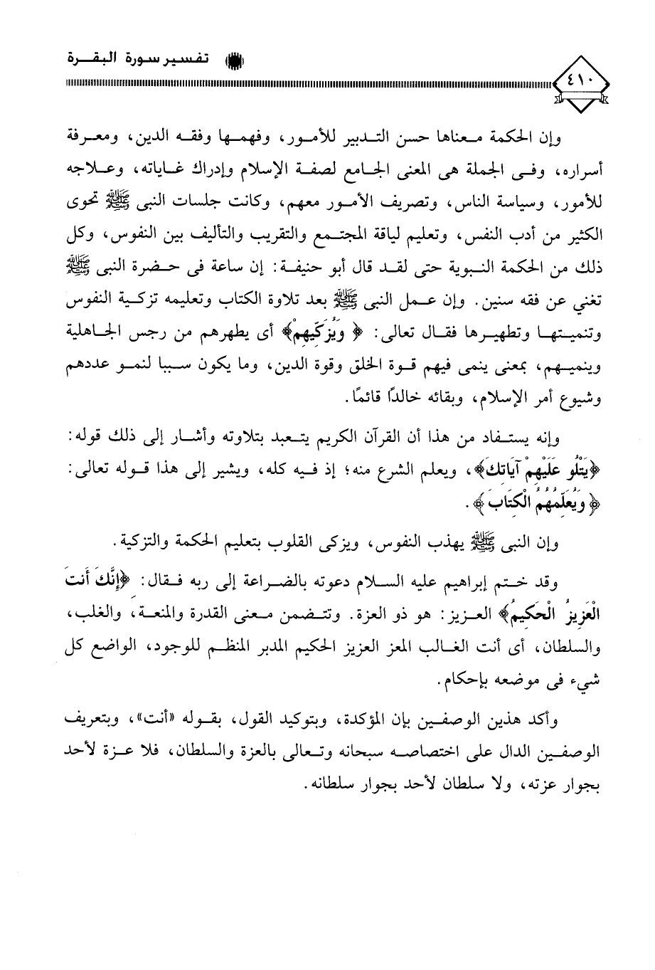 وإن الحكمة معناها حسن التدبير للأمور، وفهمها وفقه الدين، ومعرفة أسراره، وفي الجملة هي المعنى الجامع لصفة الإسلام وإدراك غاياته، وعلاجه للأمور، وسياسة الناس، وتصريف الأمور معهم، وكانت جلسات النبي - صلى الله عليه وسلم - تحوي الكثير من أدب النفس، وتعليم لياقة المجتمع والتقريب والتأليف بين النفوس، وكل ذلك من الحكمة النبوية حتى لقد قال أبو حنيفة: إن ساعة في حضرة النبي - صلى الله عليه وسلم - تغني عن فقه سنين. وإن عمل النبي - صلى الله عليه وسلم - بعد تلاوة الكتاب وتعليمه تزكية النفوس وتنميتها وتطهيرها فقال تعالى: (وَيُزَكِّيهِمْ) أي يطهرهم من رجس الجاهلية وينميهم، بمعنى ينمي فيهم قوة الخلق وقوة الدين، وما يكون سببا لنمو عددهم وشيوع أمر الإسلام، وبقائه خالدًا قائمًا.