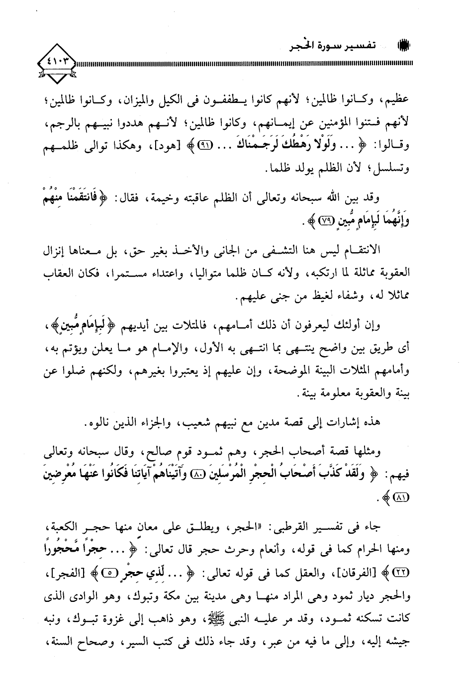 جاء في تفسير القرطبي: " الحجر، ويطلق على معان منها حجر الكعبة، ومنها الحرام كما في قوله، وأنعام وحرث حجر قال تعالى: (. . . حِجْرَا مَّحْجُورًا)، والعقل كما في قوله تعالى: (. . . لِذِي حِجْر)، والحجر ديار ثمود وهي المراد منها وهي مدينة بين مكة وتبوك، وهو الوادي الذي كانت تسكنه ثمود، وقد مر عليه النبي - صلى الله عليه وسلم -، وهو ذاهب إلى غزوة تبوك، ونبه جيشه إليه، وإلى ما فيه من عبر، وقد جاء ذلك في كتب السير، وصحاح السنة،