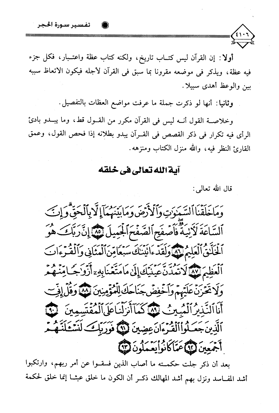 (وَمَا خَلَقْنَا السَّمَاوَاتِ وَالْأَرْضَ وَمَا بَيْنَهُمَا إِلَّا بِالْحَقِّ وَإِنَّ السَّاعَةَ لَآتِيَةٌ فَاصْفَحِ الصَّفْحَ الْجَمِيلَ (85) إِنَّ رَبَّكَ هُوَ الْخَلَّاقُ الْعَلِيمُ (86) وَلَقَدْ آتَيْنَاكَ سَبْعًا مِنَ الْمَثَانِي وَالْقُرْآنَ الْعَظِيمَ (87) لَا تَمُدَّنَّ عَيْنَيْكَ إِلَى مَا مَتَّعْنَا بِهِ أَزْوَاجًا مِنْهُمْ وَلَا تَحْزَنْ عَلَيْهِمْ وَاخْفِضْ جَنَاحَكَ لِلْمُؤْمِنِينَ (88) وَقُلْ إِنِّي أَنَا النَّذِيرُ الْمُبِينُ (89) كَمَا أَنْزَلْنَا عَلَى الْمُقْتَسِمِينَ (90) الَّذِينَ جَعَلُوا الْقُرْآنَ عِضِينَ (91) فَوَرَبِّكَ لَنَسْأَلَنَّهُمْ أَجْمَعِينَ (92) عَمَّا كَانُوا يَعْمَلُونَ (93)