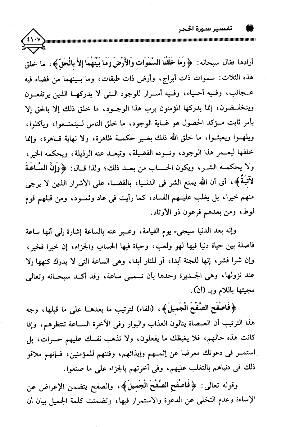 (وَمَا خَلَقْنَا السَّمَاوَاتِ وَالأَرْضَ وَمَا بَيْنَهُمَا إِلَّا بِالْحَقِّ)، مما خلق هذه الثلاث: سماوات ذات أبراج، وأرض ذات طبقات، وما بينهما من فضاء فيه عجائب، وفيه أحياء، وفيه أسرار للوجود التي لَا يدركها الذين يرتفعون وينخفضون، إنما يدركها المؤمنون برب هذا الوجود، ما خلق ذلك إلا بالحق إلا بأمر ثابت مؤكد الحصول هو غاية الوجود، ما خلق الناس ليتمتعوا، ويأكلوا، ويلهوا ويعبثوا، ما خلق الله ذلك بغير حكمة ظاهرة، ولا نهاية قاهرة، وإنما خلقها ليعمر هذا الوجود، وتسوده الفضيلة، وتبعد عنه الرذيلة، ويحكمه الخير، ولا يحكمه الشر، ويكون الحساب من بعد ذلك؛ ولذا قال: (وَإنَّ السَّاعَةَ لآتِيَة)، أي أن اللَّه يمنع الشر في الدنيا، بالقضاء على الأشرار الذين لَا يرجى منهم خيرا، بل يغلب عليهم الفساد، كما رأيت في عاد وثمود، ومن قبلهم قوم لوط، ومن بعدهم فرعون ذو الأوتاد.