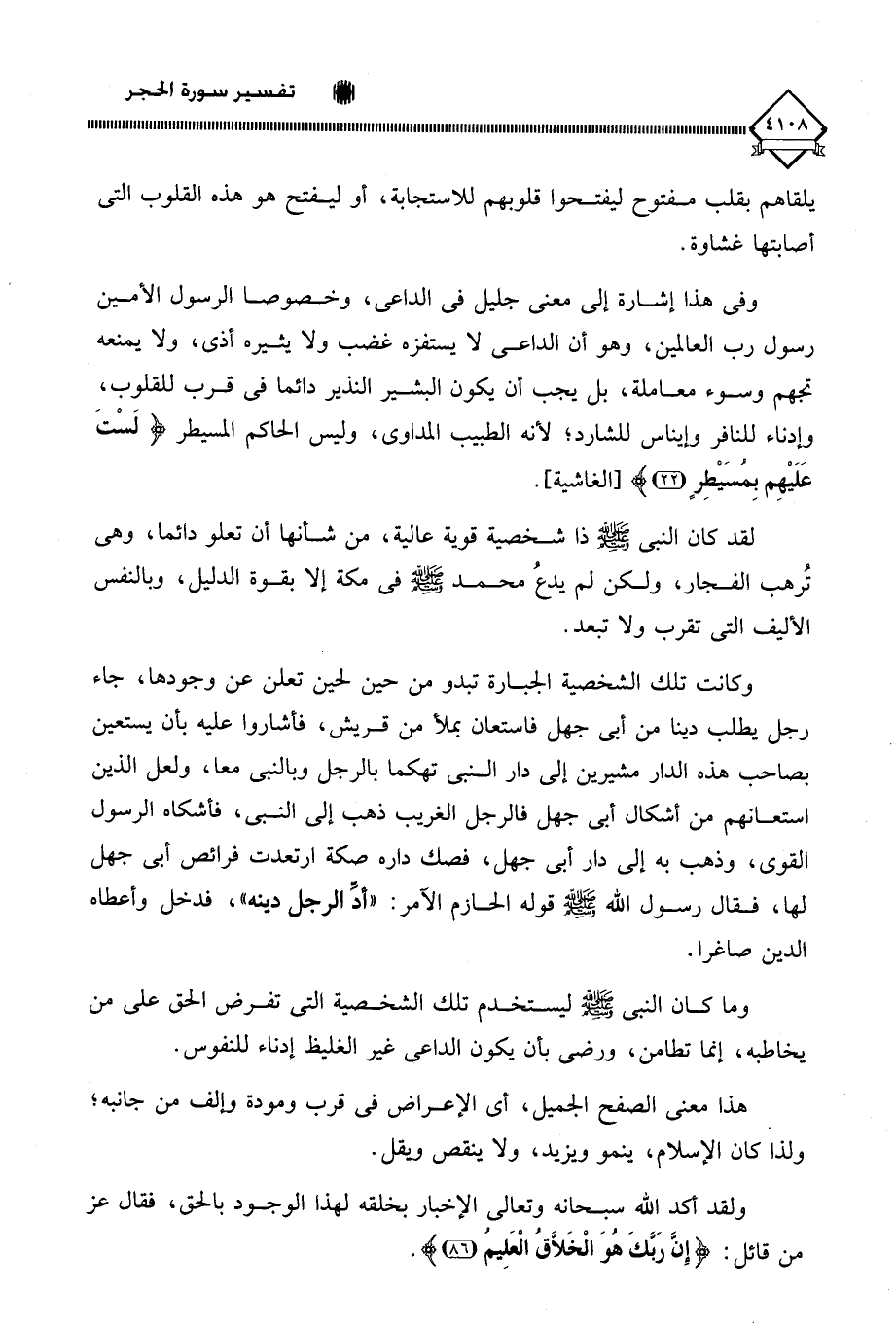 وفى هذا إشارة إلى معنى جليل في الداعي، وخصوصا الرسول الأمين رسول رب العالمين، وهو أن الداعي لَا يستفزه غضب ولا يثيره أذى، ولا يمنعه تجهم وسوء معاملة، بل يجب أن يكون البشير النذير دائما في قرب للقلوب، وإدناء للنافر وإيناس للشارد؛ لأنه الطبيب المداوي، وليس الحاكم المسيطر (لَسْتَ عَلَيْهِمْ بِمُصَيْطِرٍ).