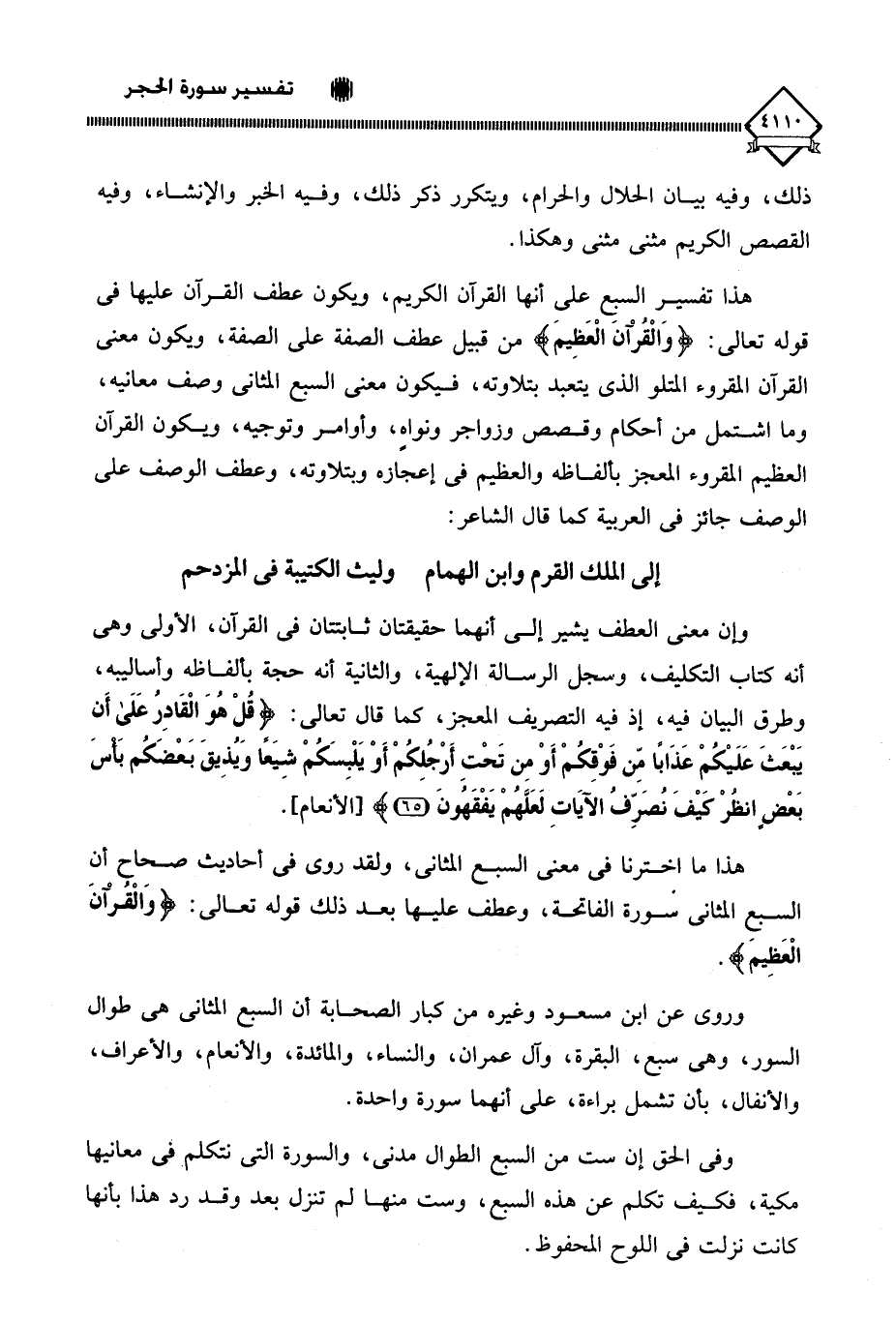 هذا تفسير السبع على أنها القرآن الكريم، ويكون عطف القرآن عليها في قوله تعالى: (وَالْقرْآنَ الْعَظِيمَ) من قبيل عطف الصفة على الصفة، ويكون معنى القرآن المقروء المتلو الذي يتعبد بتلاوته، فيكون معنى السبع المثاني وصف معانيه، وما اشتمل من أحكام وقصص وزواجر ونواهٍ، وأوامر وتوجيه، ويكون القرآن العظيم المقروء المعجز بألفاظه والعظيم في إعجازه وبتلاوته، وعطف الوصف على الوصف جائز في العربية كما قال الشاعر:
