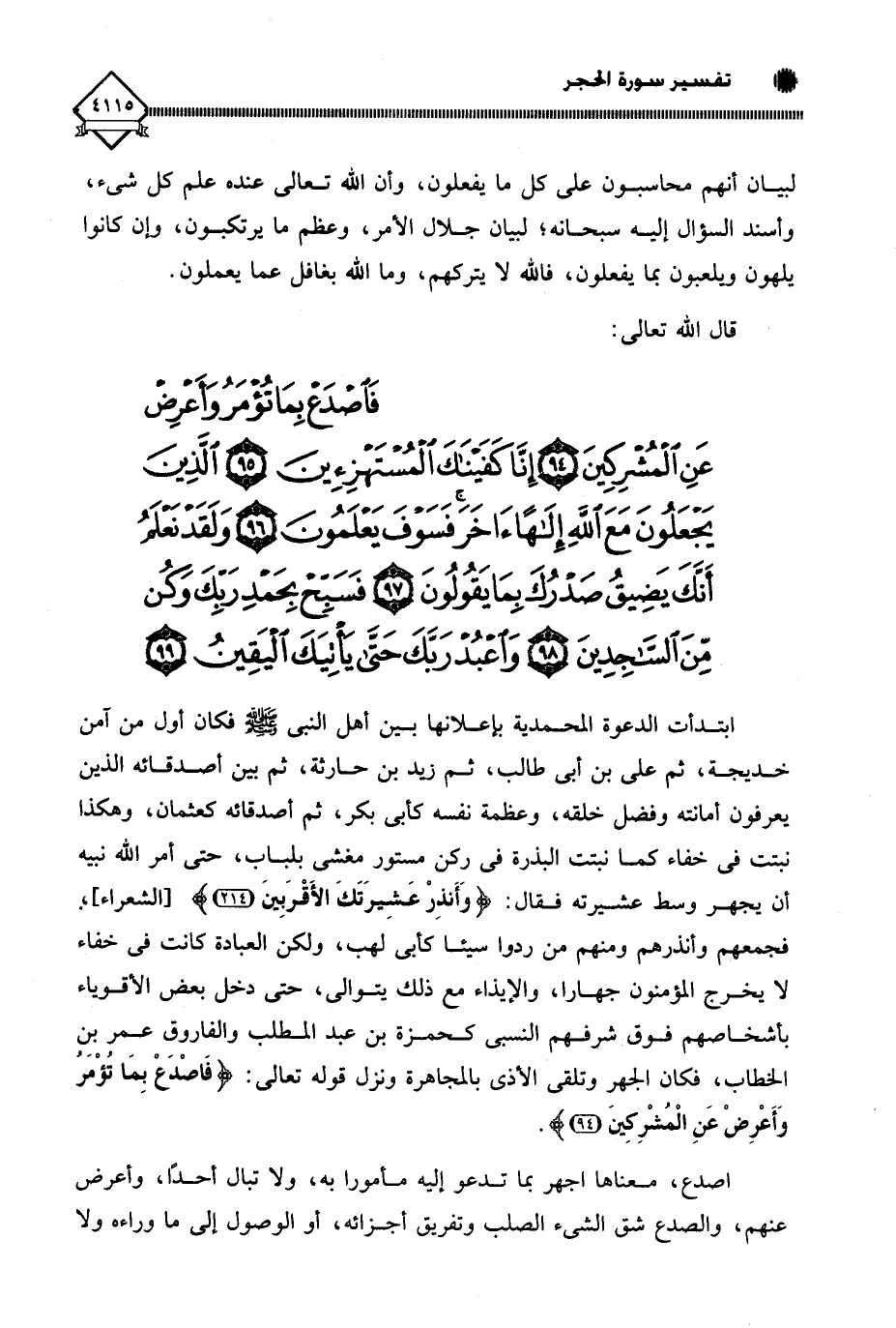 (فَاصْدَعْ بِمَا تُؤْمَرُ وَأَعْرِضْ عَنِ الْمُشْرِكِينَ (94) إِنَّا كَفَيْنَاكَ الْمُسْتَهْزِئِينَ (95) الَّذِينَ يَجْعَلُونَ مَعَ اللَّهِ إِلَهًا آخَرَ فَسَوْفَ يَعْلَمُونَ (96) وَلَقَدْ نَعْلَمُ أَنَّكَ يَضِيقُ صَدْرُكَ بِمَا يَقُولُونَ (97) فَسَبِّحْ بِحَمْدِ رَبِّكَ وَكُنْ مِنَ السَّاجِدِينَ (98) وَاعْبُدْ رَبَّكَ حَتَّى يَأْتِيَكَ الْيَقِينُ (99)
