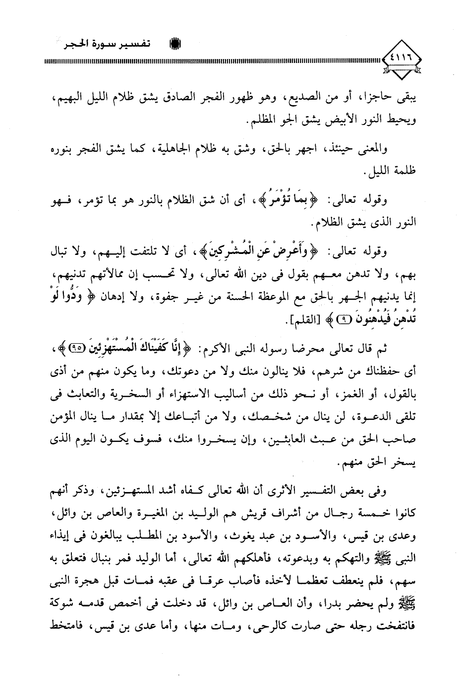 وفي بعض التفسير الأثري أن اللَّه تعالى كفاه أشد المستهزئين، وذكر أنهم كانوا خمسة رجال من أشراف قريش هم الوليد بن المغيرة والعاص بن وائل، وعدي بن قيس، والأسود بن عبد يغوث، والأسود بن المطلب يبالغون في إيذاء النبي - صلى الله عليه وسلم - والتهكم به وبدعوته، فأهلكهم الله تعالى، أما الوليد فمر بنبال فتعلق به سهم، فلم ينعطف تعظما لأخذه فأصاب عرقا في عقبه فمات قبل هجرة النبي - صلى الله عليه وسلم - ولم يحضر بدرا، وأن العاص بن وائل، قد دخلت في أخمص قدمه شوكة فانتفخت رجله حتى صارت كالرحى، ومات منها، وأما عدي بن قيس، فامتخط