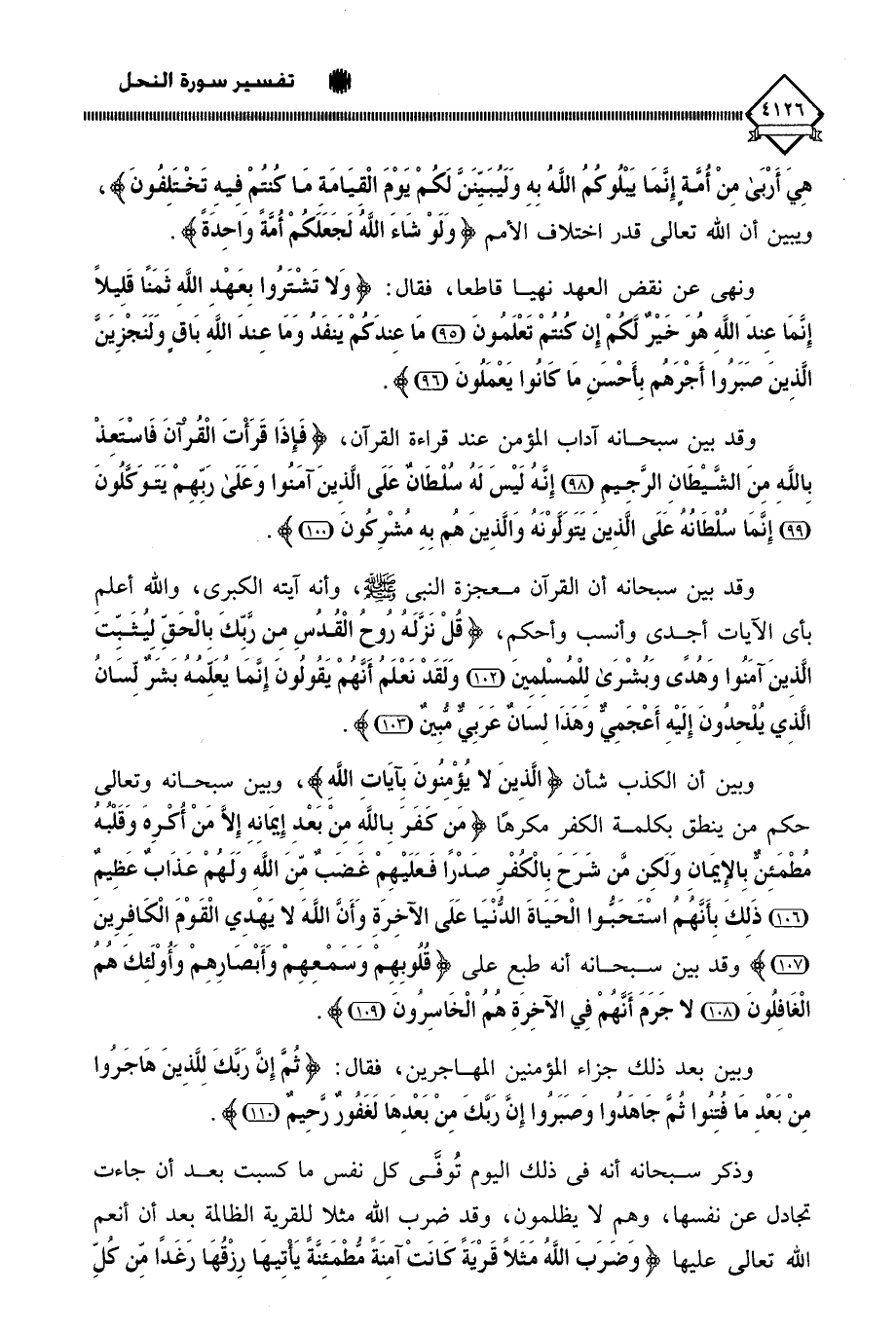 وذكر سبحانه أنه في ذلك اليوم تُوفَّى كل نفس ما كسبت بعد أن جاءت تجادل عن نفسها، وهم لَا يظلمون، وقد ضرب اللَّه مثلا للقرية الظالمة بعد أن أنعم اللَّه تعالى عليها (وَضَرَبَ اللَّهُ مَثَلًا قَرْيَةً كَانَتْ آمِنَةً مُطْمَئِنَّةً يَأْتِيهَا رِزْقُهَا رَغَدًا مِنْ كُلِّ