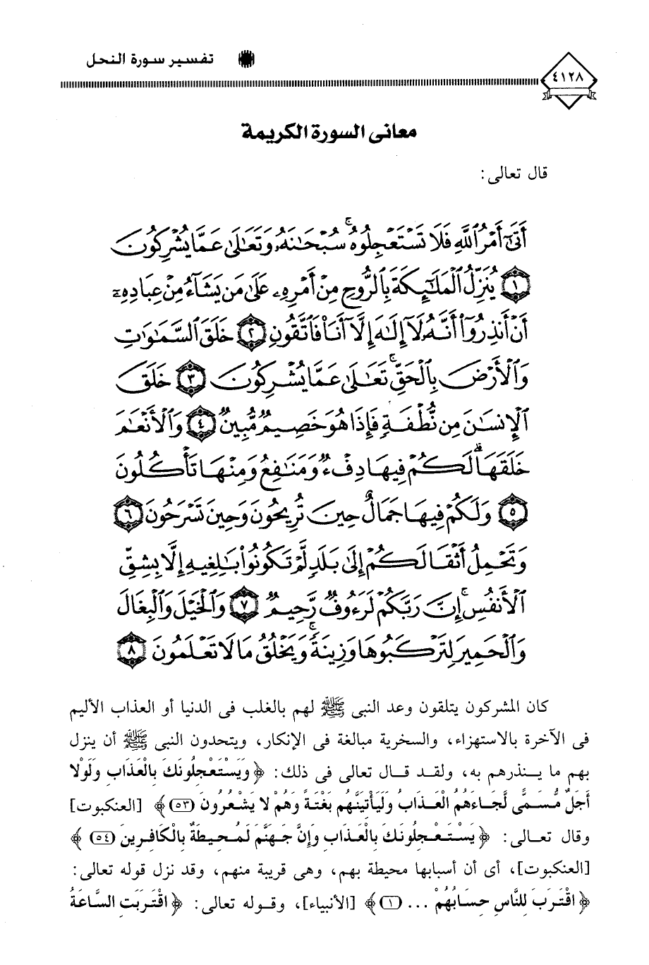 (أَتَى أَمْرُ اللَّهِ فَلَا تَسْتَعْجِلُوهُ سُبْحَانَهُ وَتَعَالَى عَمَّا يُشْرِكُونَ (1) يُنَزِّلُ الْمَلَائِكَةَ بِالرُّوحِ مِنْ أَمْرِهِ عَلَى مَنْ يَشَاءُ مِنْ عِبَادِهِ أَنْ أَنْذِرُوا أَنَّهُ لَا إِلَهَ إِلَّا أَنَا فَاتَّقُونِ (2) خَلَقَ السَّمَاوَاتِ وَالْأَرْضَ بِالْحَقِّ تَعَالَى عَمَّا يُشْرِكُونَ (3) خَلَقَ الْإِنْسَانَ مِنْ نُطْفَةٍ فَإِذَا هُوَ خَصِيمٌ مُبِينٌ (4) وَالْأَنْعَامَ خَلَقَهَا لَكُمْ فِيهَا دِفْءٌ وَمَنَافِعُ وَمِنْهَا تَأْكُلُونَ (5) وَلَكُمْ فِيهَا جَمَالٌ حِينَ تُرِيحُونَ وَحِينَ تَسْرَحُونَ (6) وَتَحْمِلُ أَثْقَالَكُمْ إِلَى بَلَدٍ لَمْ تَكُونُوا بَالِغِيهِ إِلَّا بِشِقِّ الْأَنْفُسِ إِنَّ رَبَّكُمْ لَرَءُوفٌ رَحِيمٌ (7) وَالْخَيْلَ وَالْبِغَالَ وَالْحَمِيرَ لِتَرْكَبُوهَا وَزِينَةً وَيَخْلُقُ مَا لَا تَعْلَمُونَ (8)