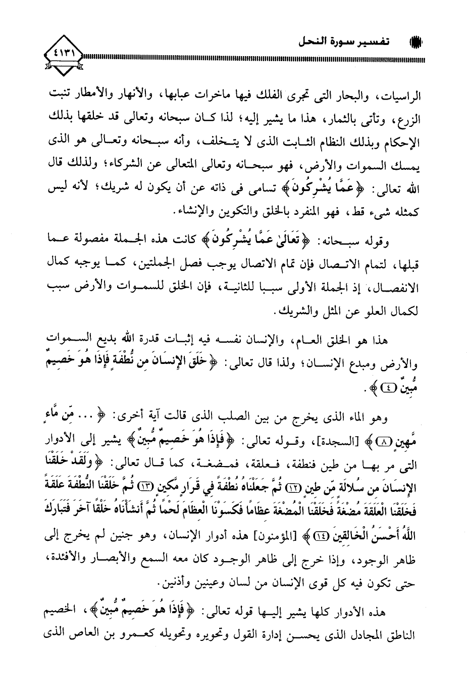 وهو الماء الذي يخرج من بين الصلب الذي قالت آية أخرى: (. . . مِن مَّاء مَّهِينٍ)، وقوله تعالى: (فَإِذَا هُوَ خَصِيمٌ مبِينٌ) يشير إلى الأدوار التي مر بها من طين فنطفة، فعلقة، فمضغة، كما قال تعالى: (وَلَقَدْ خَلَقْنَا الْإِنْسَانَ مِنْ سُلَالَةٍ مِنْ طِينٍ (12) ثُمَّ جَعَلْنَاهُ نُطْفَةً فِي قَرَارٍ مَكِينٍ (13) ثُمَّ خَلَقْنَا النُّطْفَةَ عَلَقَةً فَخَلَقْنَا الْعَلَقَةَ مُضْغَةً فَخَلَقْنَا الْمُضْغَةَ عِظَامًا فَكَسَوْنَا الْعِظَامَ لَحْمًا ثُمَّ أَنْشَأْنَاهُ خَلْقًا آخَرَ فَتَبَارَكَ اللَّهُ أَحْسَنُ الْخَالِقِينَ (14)، هذه أدوار الإنسان، وهو جنين لم يخرج إلى ظاهر الوجود، وإذا خرج إلى ظاهر الوجود كان معه السمع والأبصار والأفئدة، حتى تكون فيه كل قوى الإنسان من لسان وعينين وأذنين.