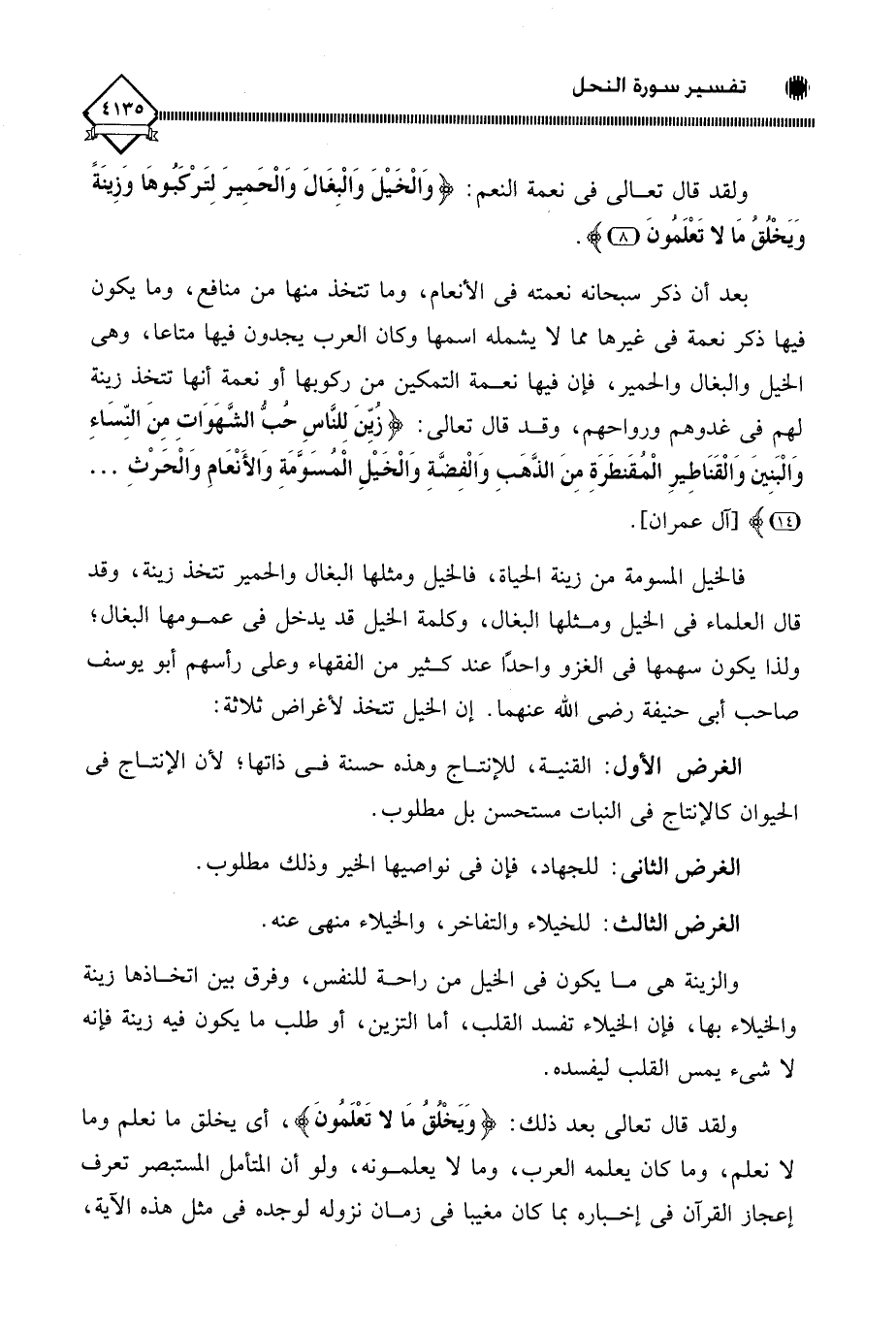 فالخيل المسومة من زينة الحياة، فالخيل ومثلها البغال والحمير تتخذ زينة، وقد قال العلماء في الخيل ومثلها البغال، وكلمة الخيل قد يدخل في عمومها البغال؛ ولذا يكون سهمها في الغزو واحدًا عند كثير من الفقهاء وعلى رأسهم أبو يوسف صاحب أبي حنيفة رضي اللَّه عنهما. إن الخيل تتخذ لأغراض ثلاثة: الغرض الأول: القنية، للإنتاج وهذه حسنة في ذاتها؛ لأن الإنتاج في الحيوان كالإنتاج في النبات مستحسن بل مطلوب.