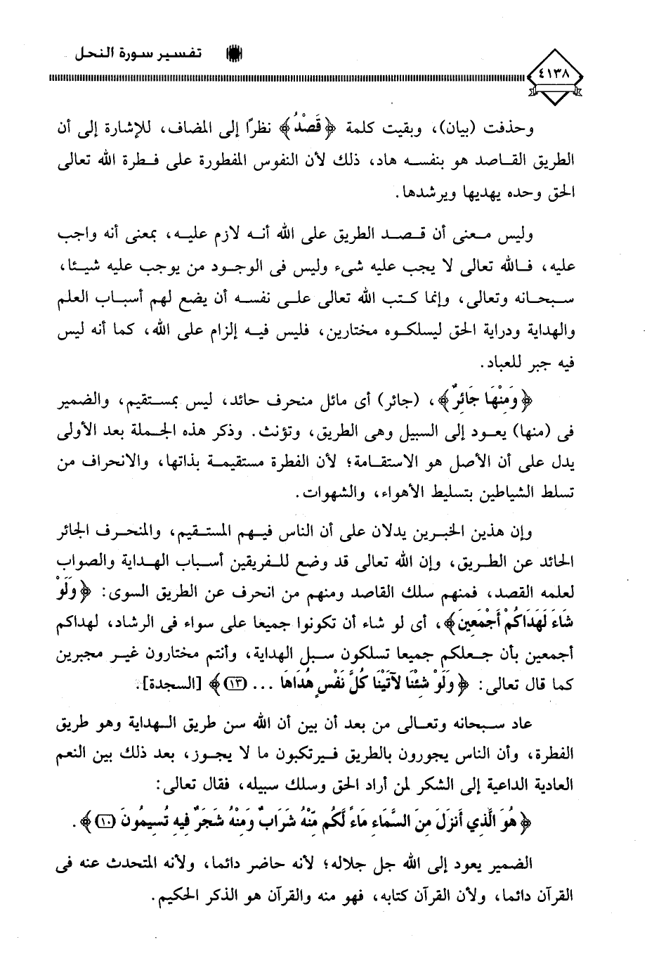 وليس معنى أن قصد الطريق على اللَّه أنه لازم عليه، بمعنى أنه واجب عليه، فاللَّه تعالى لَا يجب عليه شيء وليس في الوجود من يوجب عليه شيئا، سبحانه وتعالى، وإنما كتب الله تعالى على نفسه أن يضع لهم أسباب العلم والهداية ودراية الحق ليسلكوه مختارين، فليس فيه إلزام على اللَّه، كما أنه ليس فيه جبر للعباد.