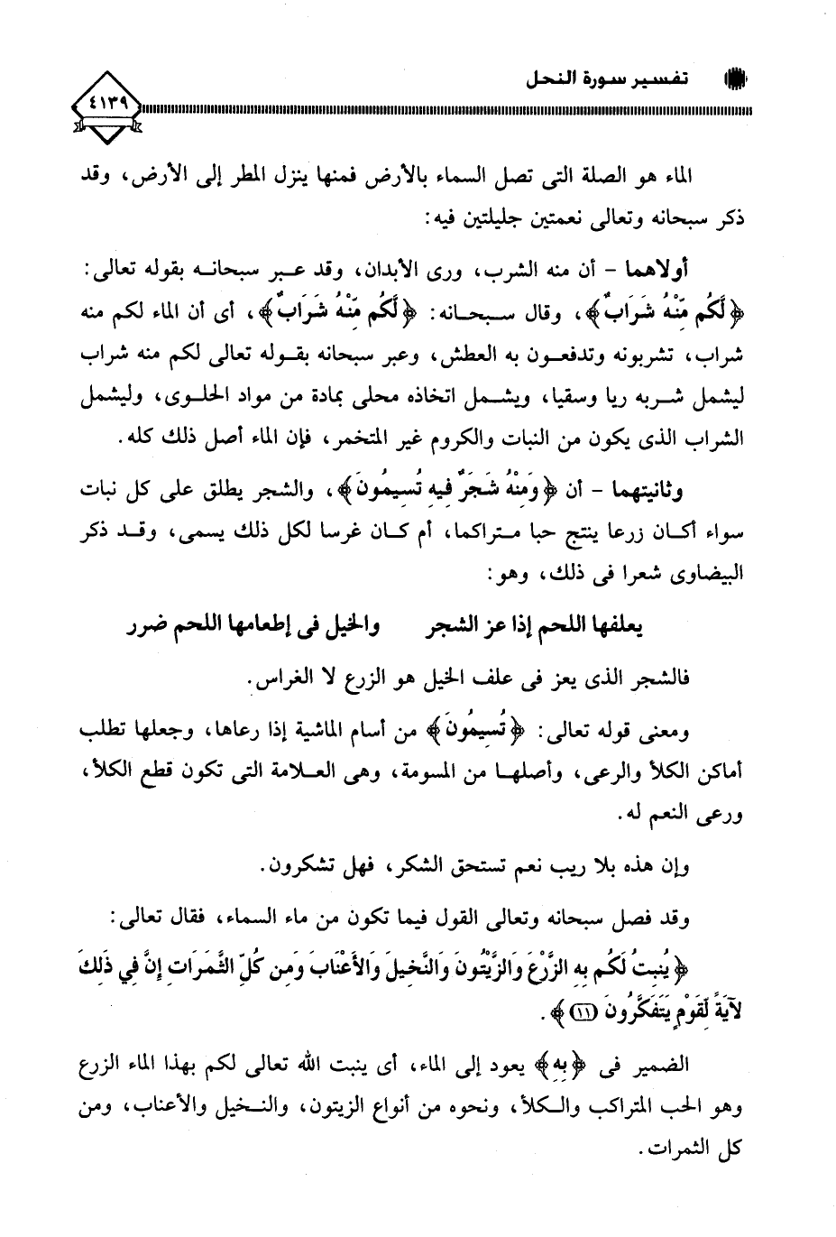 فالشجر الذي يعز في علف الخيل هو الزرع لَا الغراس ومعنى قوله تعالى: (تُسِيمُونَ) من أسام الماشية إذا رعاها، وجعلها تطلب أماكن الكلأ والرعي، وأصلها من المسومة، وهي العلامة التي تكون قطع الكلأ، ورعي النعم له.