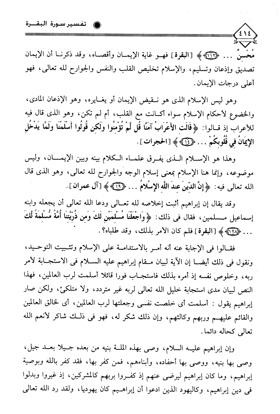 مُحْسِنٌ. . .)، فهو غاية الإيمان وأقصاه، وقد ذكرنا أن الإيمان تصديق وإذعان وتسليم، والإسلام تخليص القلب والنفس والجوارح لله تعالى، فهو أعلى درجات الإيمان.