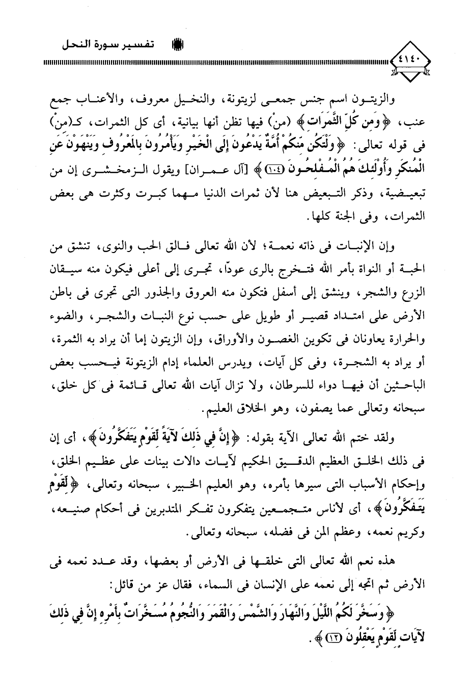 والزيتون اسم جنس جمعي لزيتونة، والنخيل معروف، والأعناب جمع عنب، (وَمِن كُلِّ الثَّمَرَات) (منْ) فيها تظن أنها بيانية، أي كل الثمرات، كـ (مِن) في قوله تعالى: (وَلْتَكُنَ مِّنكُمْ أُمَّةٌ يَدْعُونَ إِلَى الْخَيْرِ وَيَأْمُرُونَ بِالمَعْرُوفِ وَيَنْهَوْنَ عنِ الْمُنكَرِ وَأولَئِكَ هُمُ الْمُفْلِحُونَ)، ويقول الزمخشري إن من تبعيضية، وذكر التبعيض هنا لأن ثمرات الدنيا مهما كبرت وكثرت هي بعض الثمرات، وفي الجنة كلها.