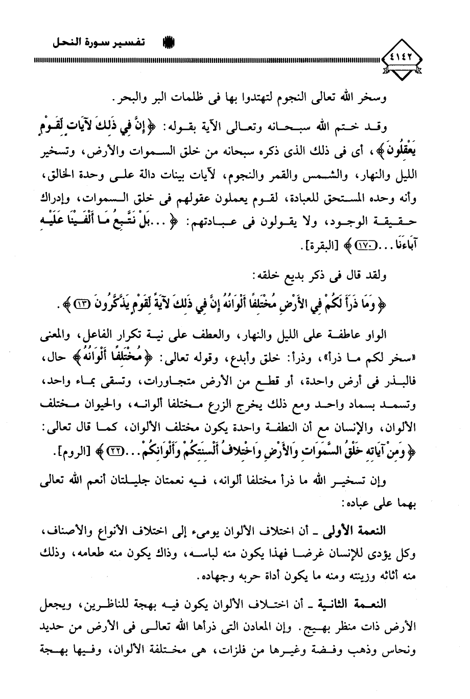 النعمة الأولى - أن اختلاف الألوان يومئ إلى اختلاف الأنواع والأصناف، وكل يؤدي للإنسان غرضا فهذا يكون منه لباسه، وذاك يكون منه طعامه، وذلك منه أثاثه وزينته ومنه ما يكون أداة حربه وجهاده.
