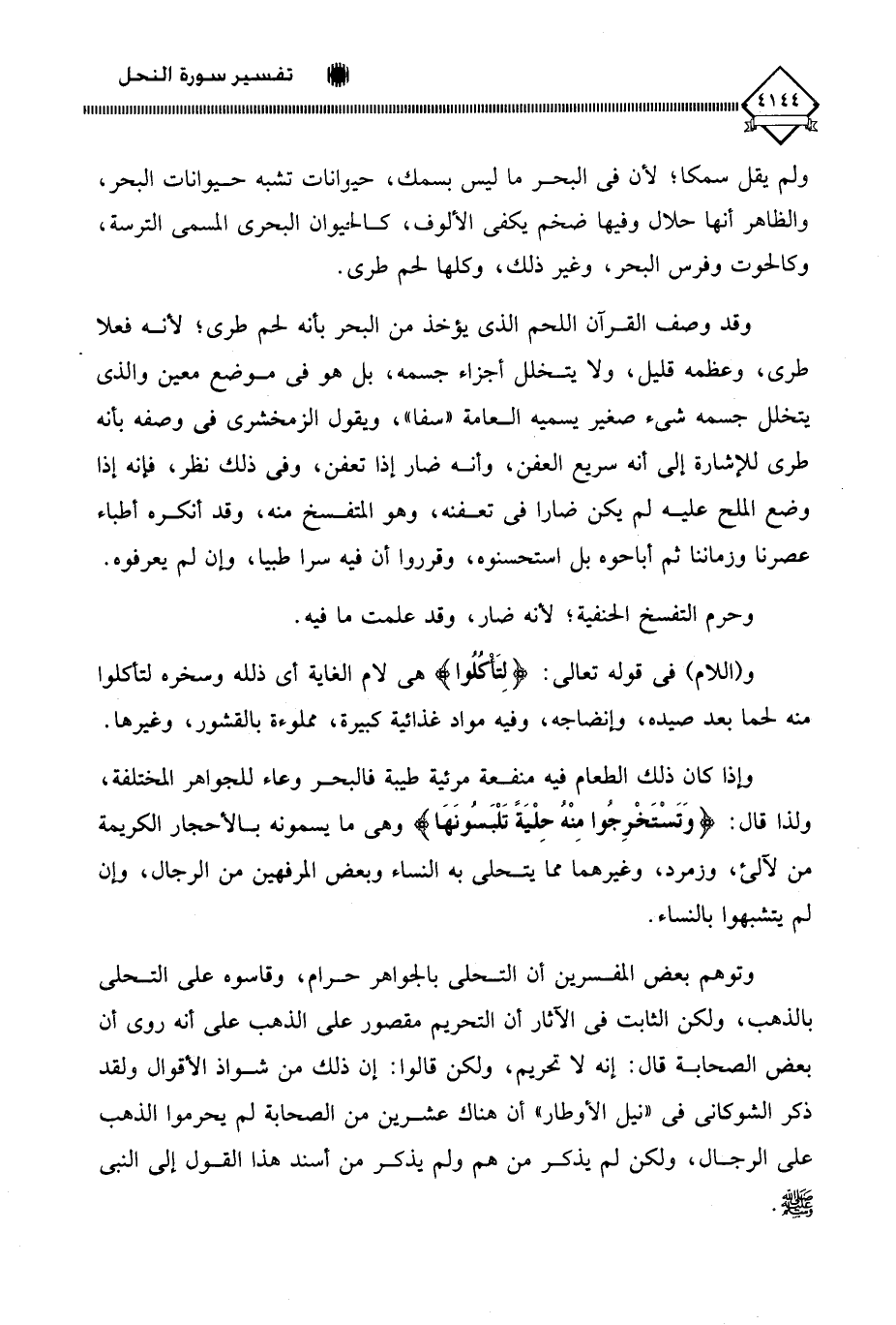 وإذا كان ذلك الطعام فيه منفعة مرئية طيبة فالبحر وعاء للجواهر المختلفة، ولذا قال: (وَتَسْتَخْرِجُوا مِنْهُ حِلْيَةً تَلْبَسُونَهَا) وهي ما يسمونه بالأحجار الكريمة من لآلئ، وزمرد، وغيرهما مما يتحلى به النساء وبعض المرفهين من الرجال، وإن لم يتشبهوا بالنساء.