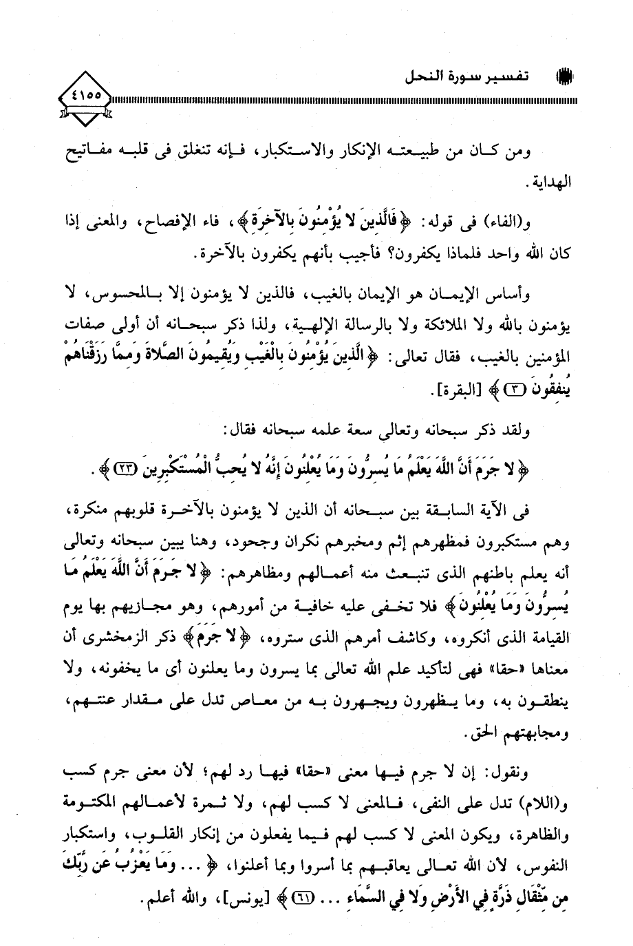 ونقول: إن لَا جرم فيها معنى (حقا) فيها رد لهم؛ لأن معنى جرم كسب و (اللام) تدل على النفي، فالمعنى لَا كسب لهم، ولا ثمرة لأعمالهم المكتومة والظاهرة، ويكون المعنى لَا كسب لهم فيما يفعلون من إنكار القلوب، واستكبار النفوس، لأن اللَّه تعالى يعاقبهم بما أسروا وبما أعلنوا، (. . . وَمَا يَعْزُبُ عَنْ رَبِّكَ مِنْ مِثْقَالِ ذَرَّةٍ فِي الْأَرْضِ وَلَا فِي السَّمَاءِ. . .)، واللَّه أعلم.