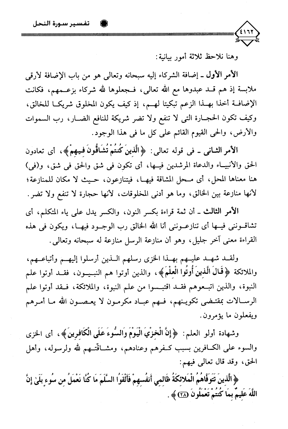 الأمر الثاني - في قوله تعالى: (الَّذِينَ كُنتُمْ تُشَاقُّونَ فِيهِمْ)، أي تعادون الحق والأنبياء والدعاة المرشدين فيها، أي تكون في شق والحق في شق، و (في) هنا معناها المحل، أي محل المشاقة فيها، فيتنازعون، حيث لَا مكان للمنازعة؛ لأنها منازعة بين الخالق، وما هو أدنى المخلوقات، لأنها حجارة لَا تنفع ولا تضر.