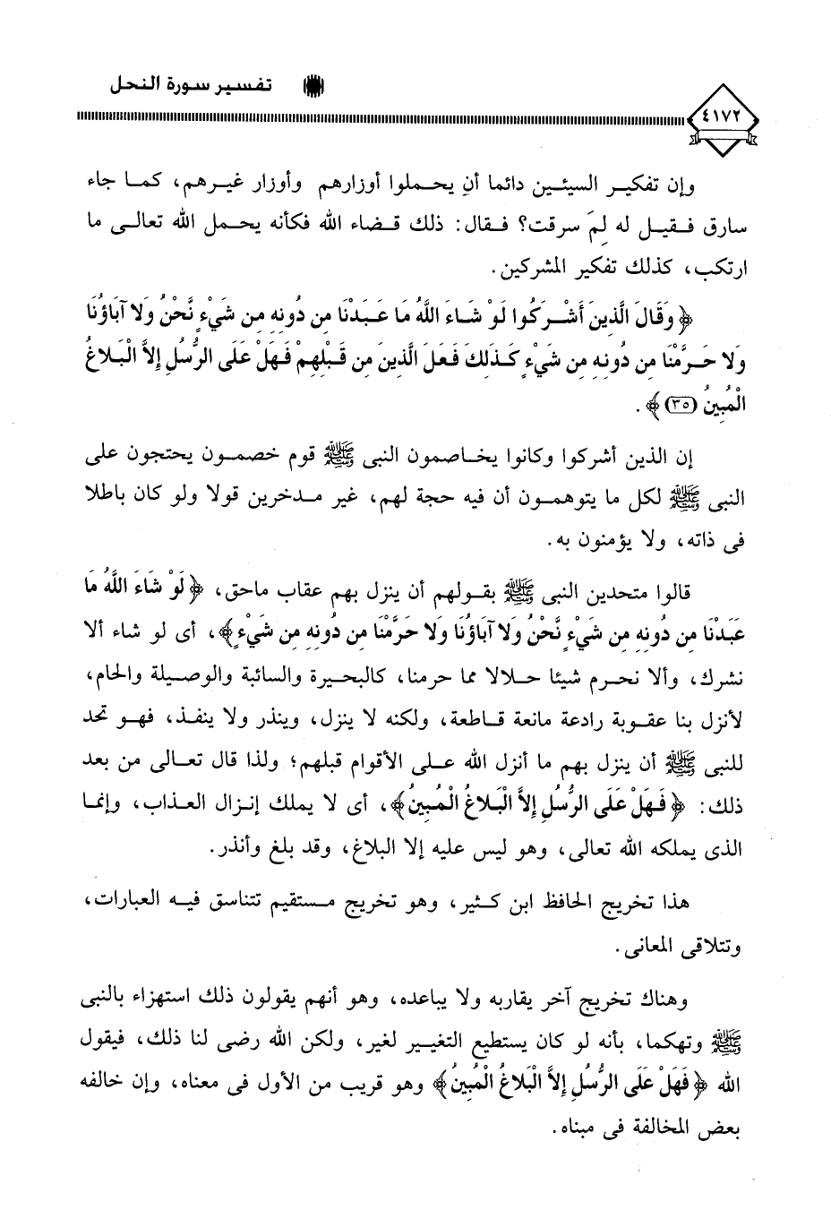 (وَقَالَ الَّذِينَ أَشْرَكُوا لَوْ شَاءَ اللَّهُ مَا عَبَدْنَا مِنْ دُونِهِ مِنْ شَيْءٍ نَحْنُ وَلَا آبَاؤُنَا وَلَا حَرَّمْنَا مِنْ دُونِهِ مِنْ شَيْءٍ كَذَلِكَ فَعَلَ الَّذِينَ مِنْ قَبْلِهِمْ فَهَلْ عَلَى الرُّسُلِ إِلَّا الْبَلَاغُ الْمُبِينُ (35)