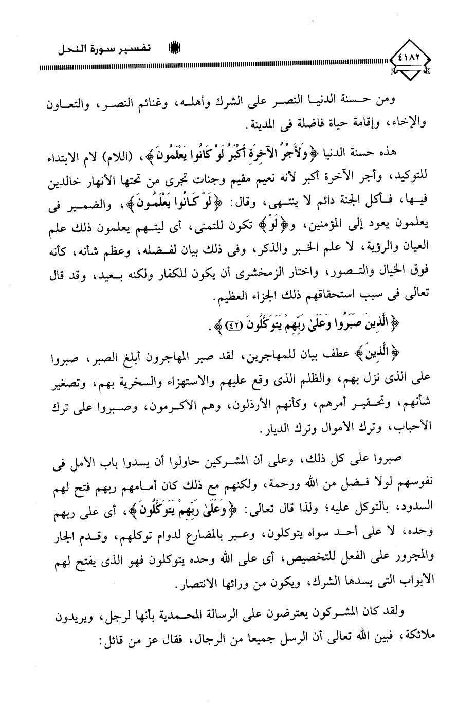 (الذينَ) عطف بيان للمهاجرين، لقد صبر المهاجرون أبلغ الصبر، صبروا على الذي نزل بهم، والظلم الذي وقع عليهم والاستهزاء والسخرية بهم، وتصغير شأنهم، وتحقير أمرهم، وكأنهم الأرذلون، وهم الأكرمون، وصبروا على ترك الأحباب، وترك الأموال وترك الديار.